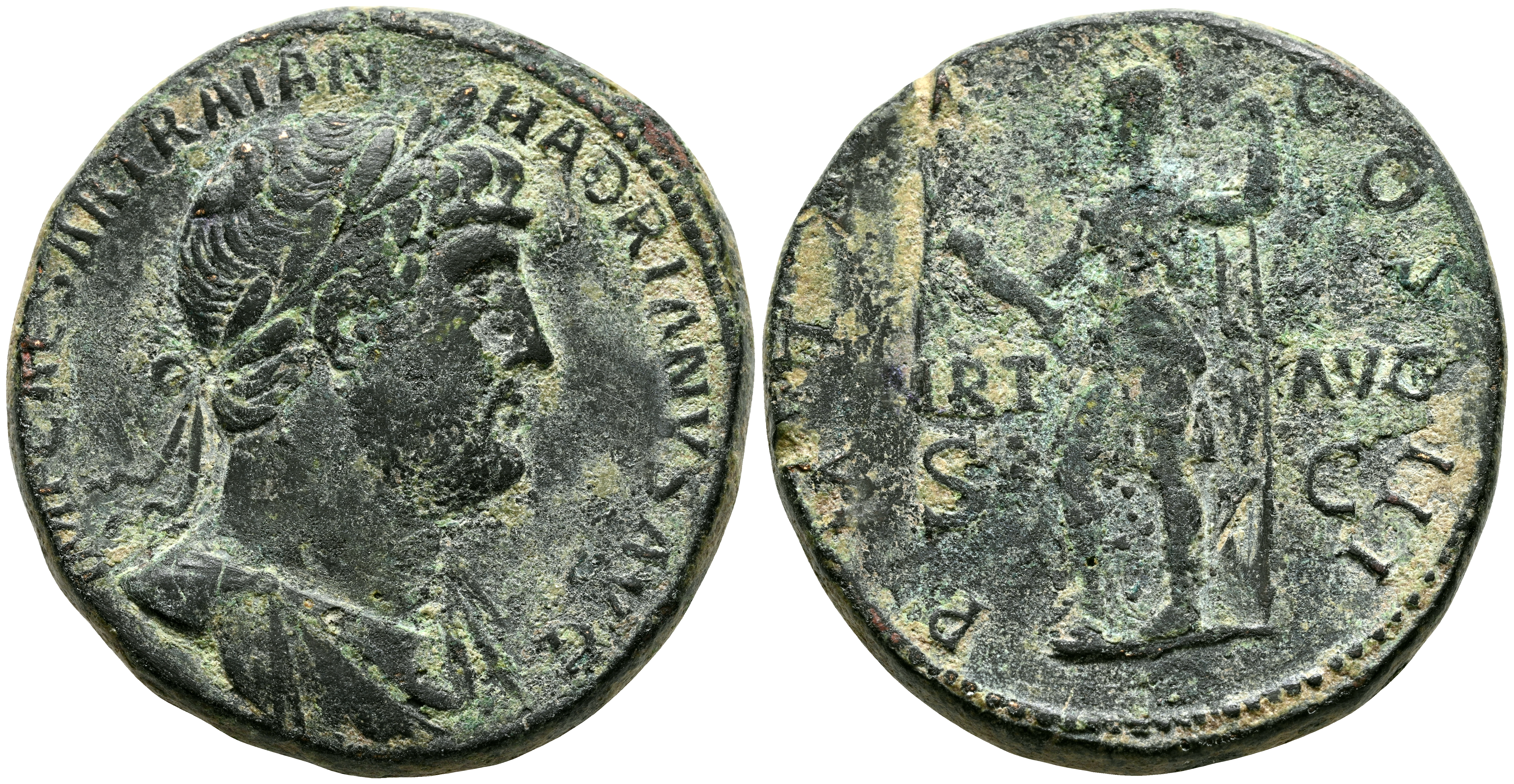 ADRIANO. Sestercio. (Ae. 25,61g/33mm). 121-123 d.C. Roma. (RIC 656). Anv: Busto laureado y drapeado de Adriano a derecha, alrededor leyenda: IMP CAESAR TRAIAN HADRIANVS AVG. Rev: Virtus estante a izquierda con cetro y parazonia, entre: VIRT-AVG/S-C, alrededor leyenda: P M TR P COS III. MBC-.