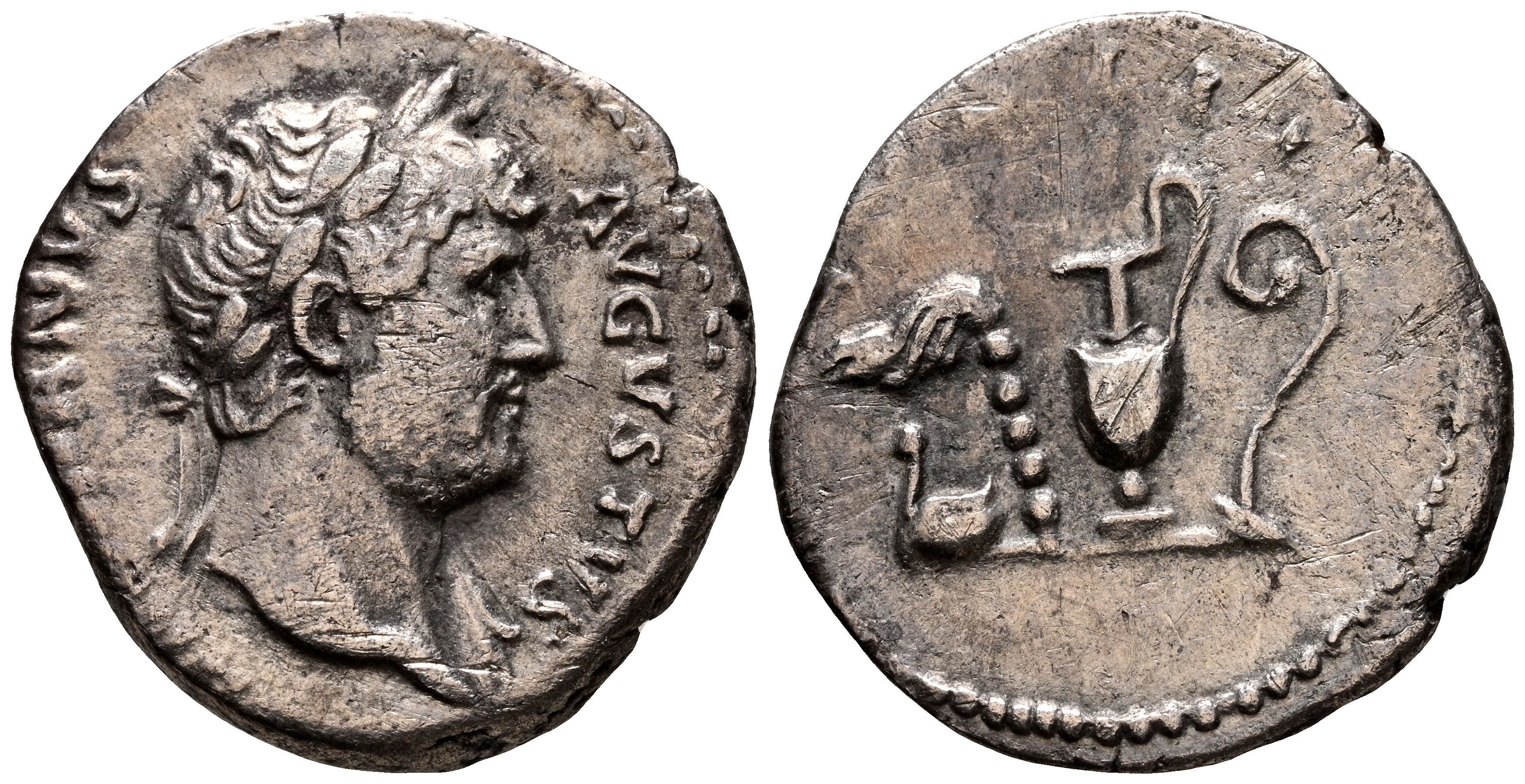 ADRIANO. Denario. (Ar. 2,84g/18mm). 126-127 d.C. Roma. (RIC 198). Anv: Cabeza laureada de Adriano a derecha, alrededor leyenda: HADRIANVS AVGVSTVS. Rev: Símpulo, aspérgilo, jarra y lítuo, encima: COS III. MBC.