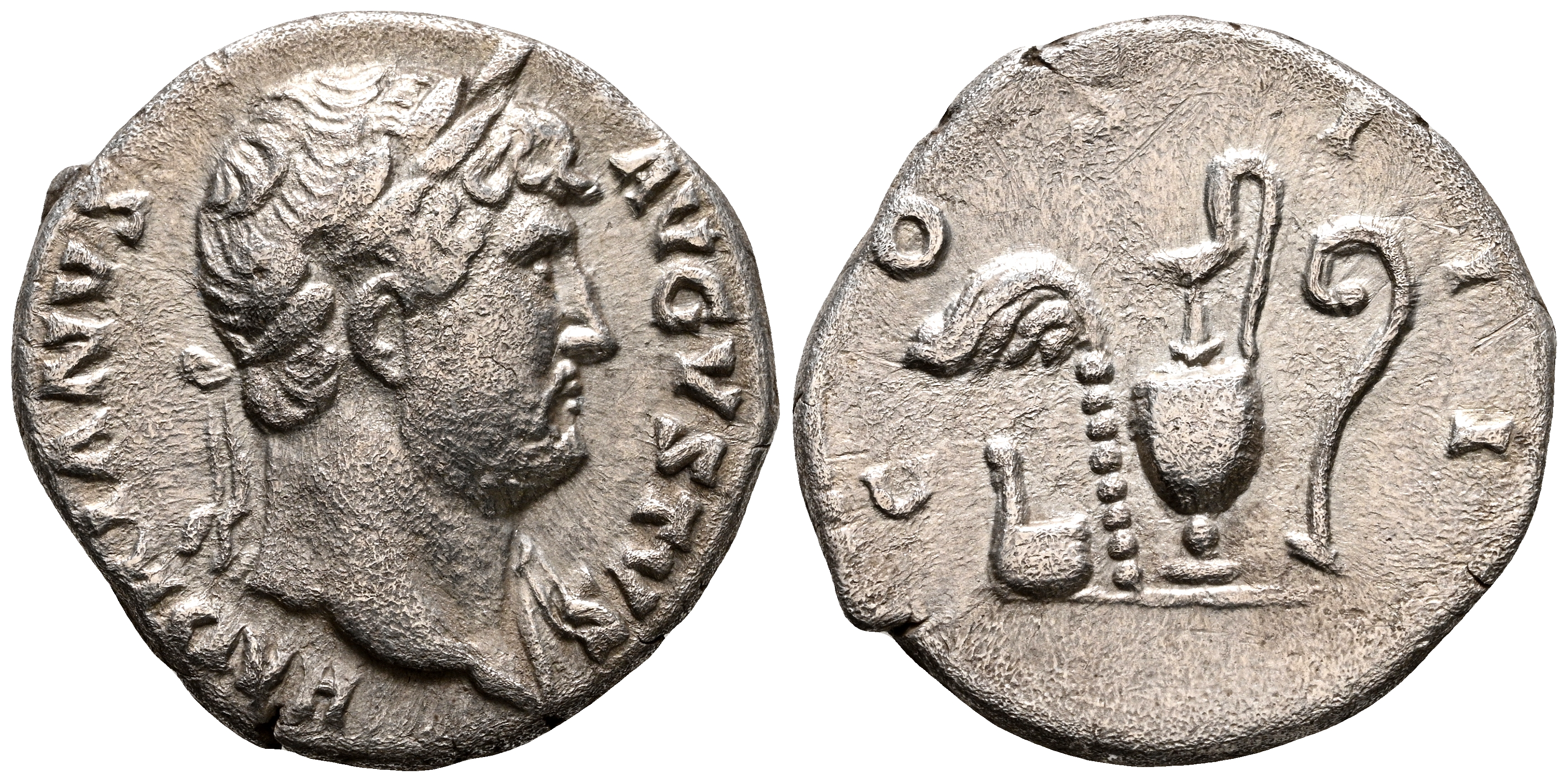 ADRIANO. Denario. (Ar. 3,16g/17mm). 125-127 d.C. Roma. (RIC 801). Anv: Busto laureado de Adriano a la derecha con ligero drapeado al hombro, alrededor leyenda: HADRIANVS AVGVSTVS. Rev: Simpulum, Aspergillum, Capis y Lituus, alrededor leyenda: COS III. MBC.