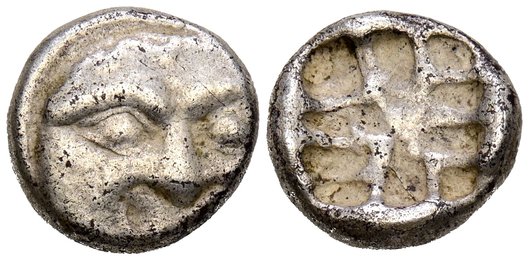 MYSIA, Parion. Dracma. (Ar. 2,63g/12mm). Siglo V a.C. (SNG Copenhaguen 256). Anv: Cabeza de Gorgona de frente. Rev: Cuadrado incuso. MBC-.