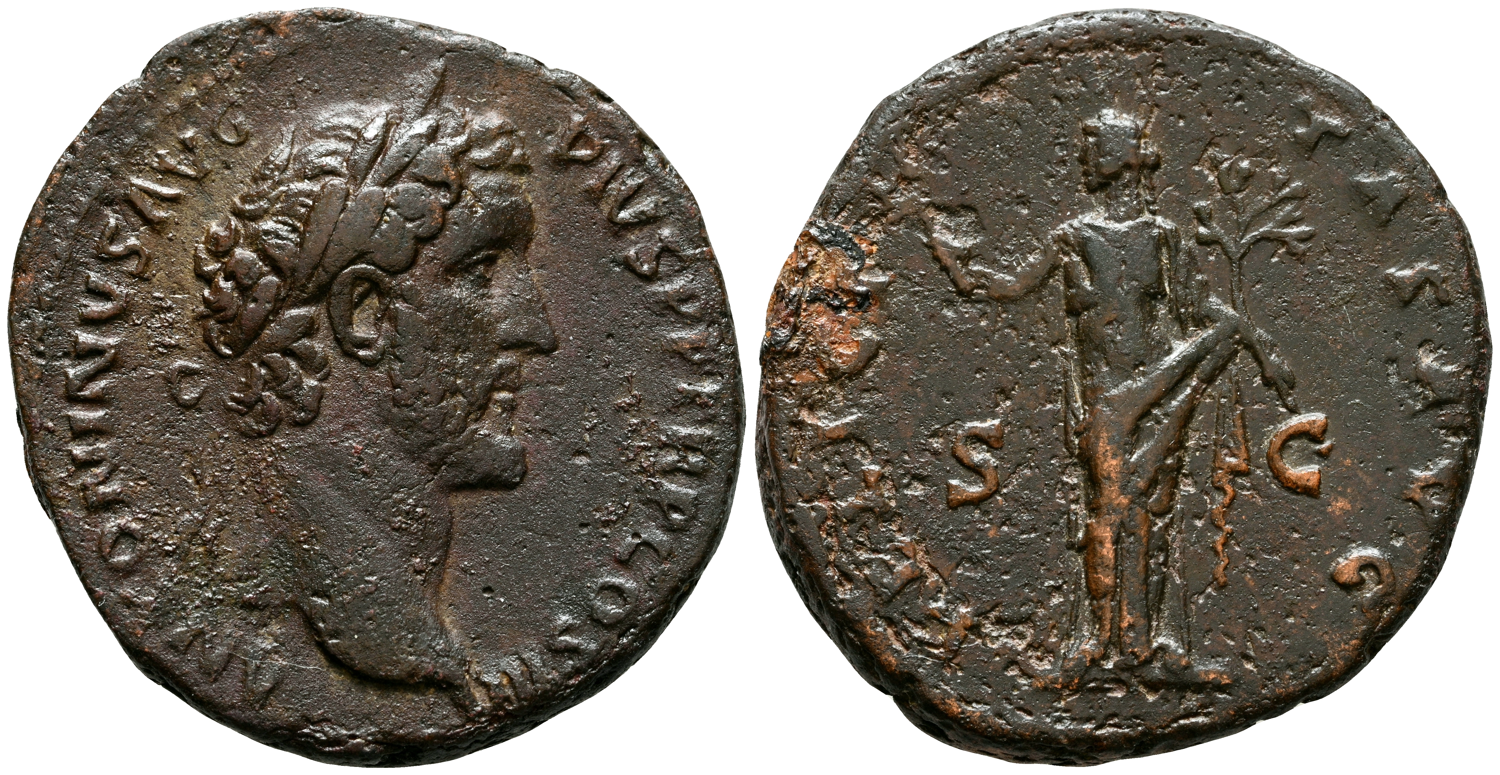ANTONINO PIO. As. (Ae. 9,28g/26mm). 140-144 d.C. Roma. (RIC 679). Anv: Cabeza laureada de Antonino Pío a derecha, alrededor leyenda: ANTONINVS AVG PIVS P P TR P COS III. Rev: Felicitas estante a izquierda portando caduceo y rama de olivo, entre: S-C, alrededor leyenda: FELICITAS AVG. MBC.
