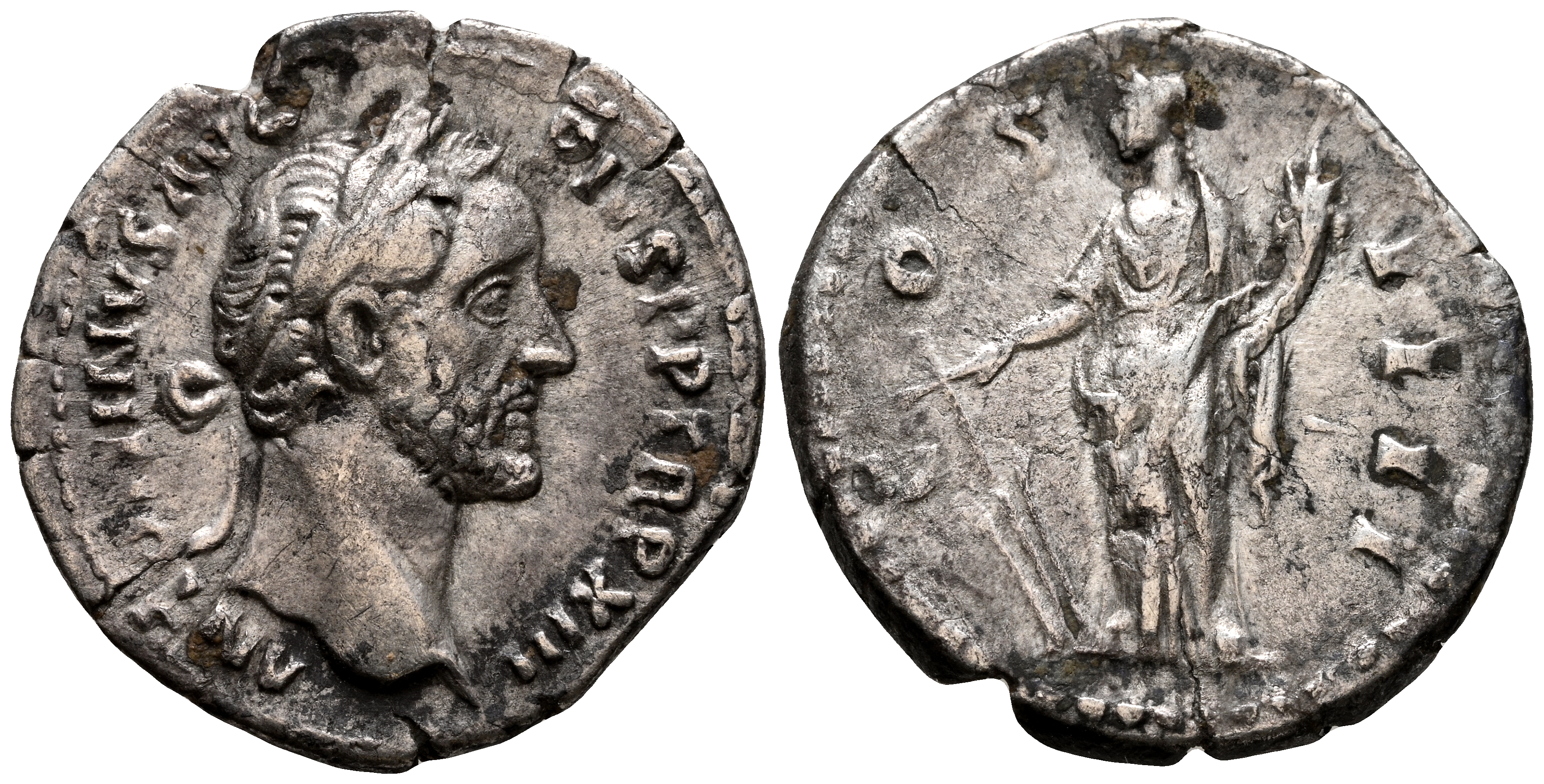 ANTONINO PIO. Denario. (Ar. 3,18g/18mm). 149-150 d.C. Roma. (RIC 188). Anv: Cabeza laureada de Antonino Pío a derecha, alrededor leyenda: ANTONINVS AVG PIVS P P TR P XIII. Rev: Fortuna estante a izquierda portando timón y cornucopia, alrededor leyenda: COS IIII. MBC.