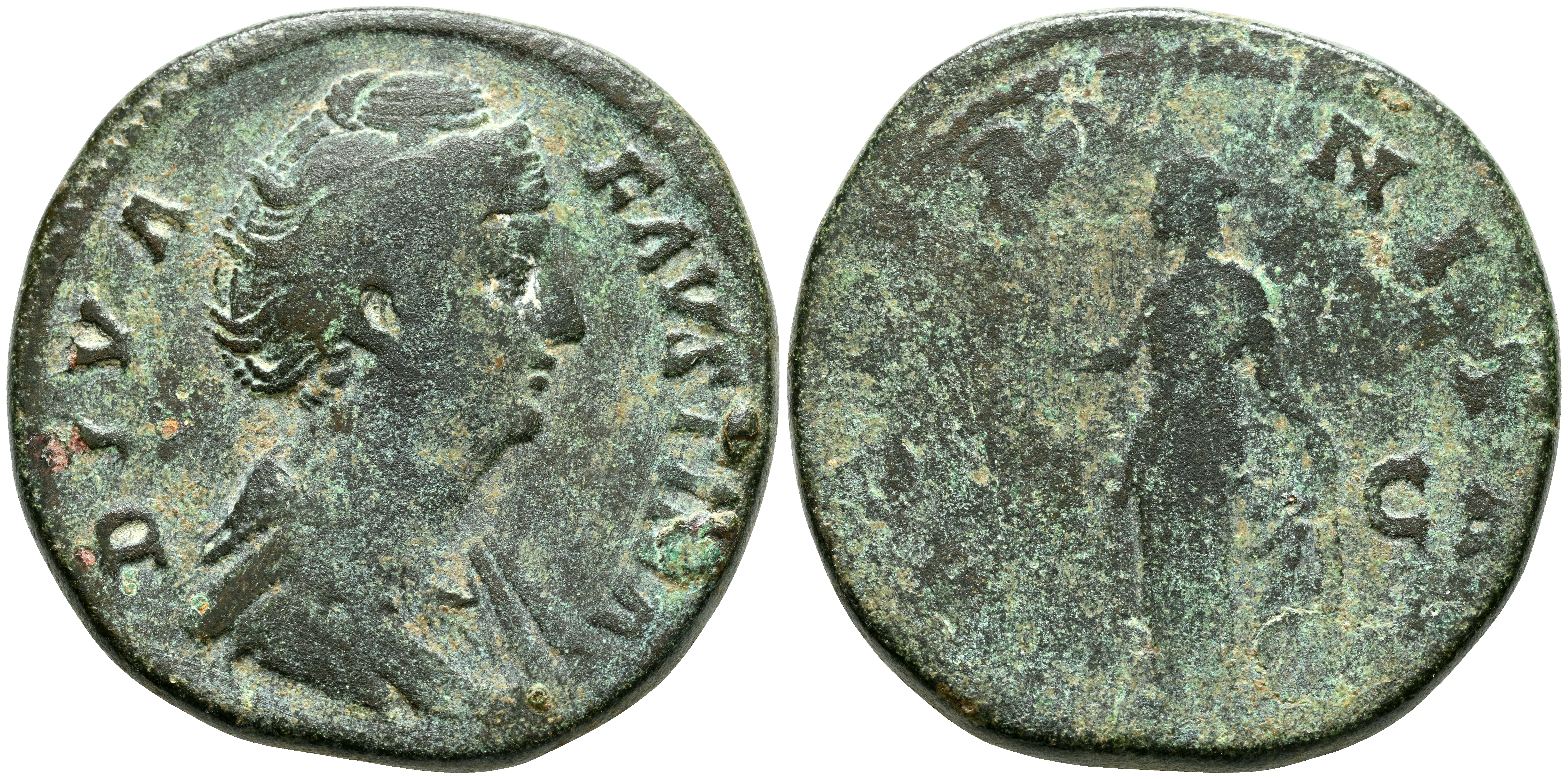 FAUSTINA I. Sestercio. (Ae. 21,60g/32mm). 141 d.C. Roma. (RIC 1102). Anv: Busto diademado y drapeado de Faustina I a derecha, alrededor leyenda: DIVA FAVSTINA. Rev: Aeternitas estante a izquierda portando globo, entre: S-C, alrededor leyenda: AETERNITAS. MBC-/BC.