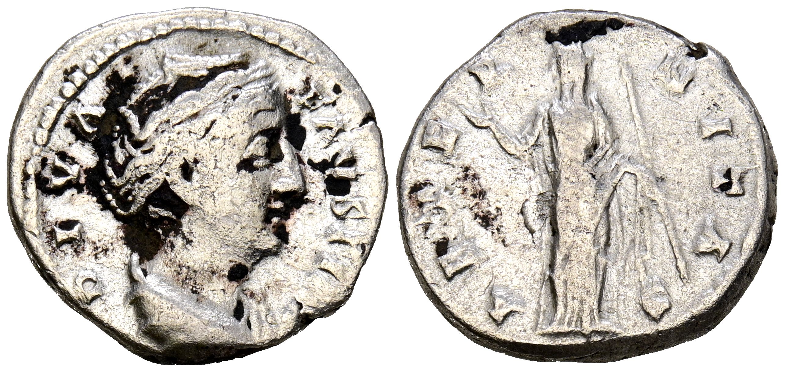 FAUSTINA I. Denario. (Ar. 3,14g/18mm). 140-141 d.C. Roma. (RIC 344). Anv: Busto diademado y drapeado de Faustina I a derecha, alrededor leyenda: DIVA FAVSTINA. Rev: Aeternitas estante a izquierda portando globo y cetro, alrededor leyenda: AETERNITAS. MBC-.