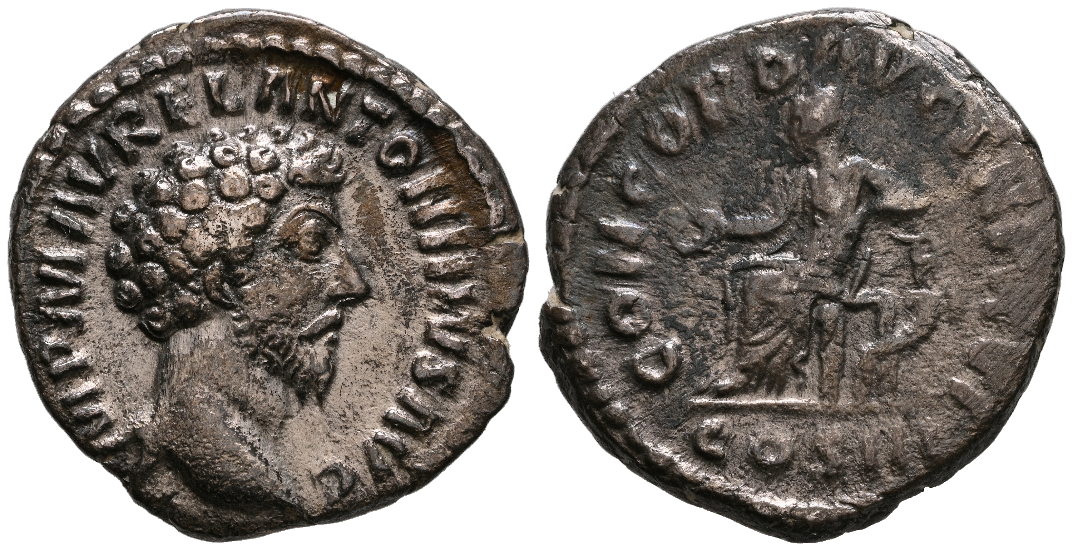 MARCO AURELIO. Denario. (Ar. 2,87g/18mm). 161-162 d.C. Roma. (RIC 35). Anv: Cabeza de Marco Aurelio a derecha, alrededor leyenda: IMP M AVREL ANTONINVS AVG. Rev: Concordia sentada a izquierda portando patera y apoyando codo izquierdo, en exergo: COS III, alrededor leyenda: CONCORD AVG TR P XVI. MBC.