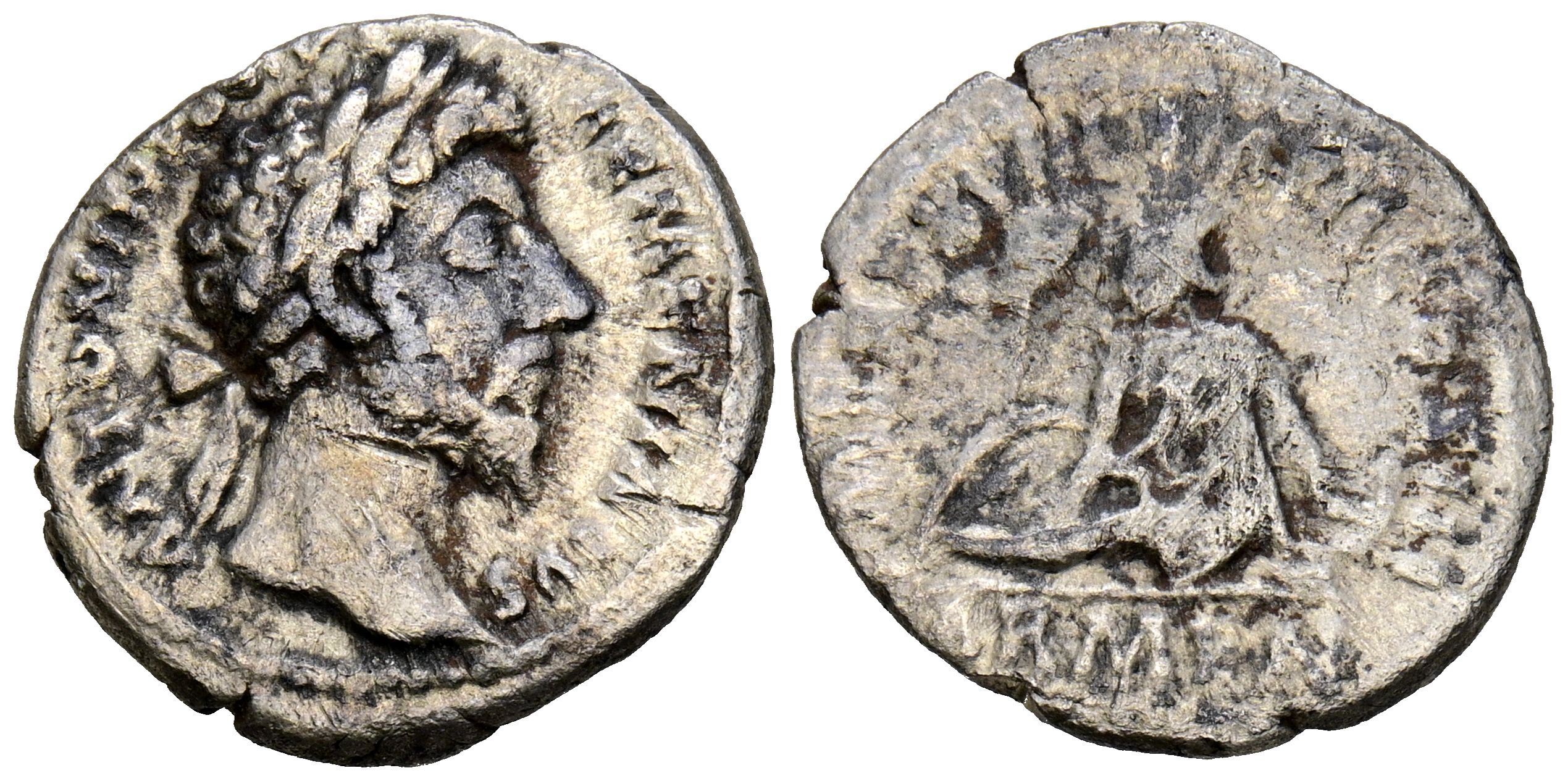 MARCO AURELIO. Denario. (Ar. 2,68g/18mm). 163-164 d.C. (RIC 81). Roma. Anv: ANTONINVS AVG ARMENICVS. Busto laureado a derecha de Marco Aurelio. Rev: Armenia sentada en el suelo a izquierda, detrás estandarte y escudo, en exergo: ARMEN, alrededor leyenda: P M TR P XVIII IMP II COS III. MBC-/BC+. Golpe fuerte en el canto.