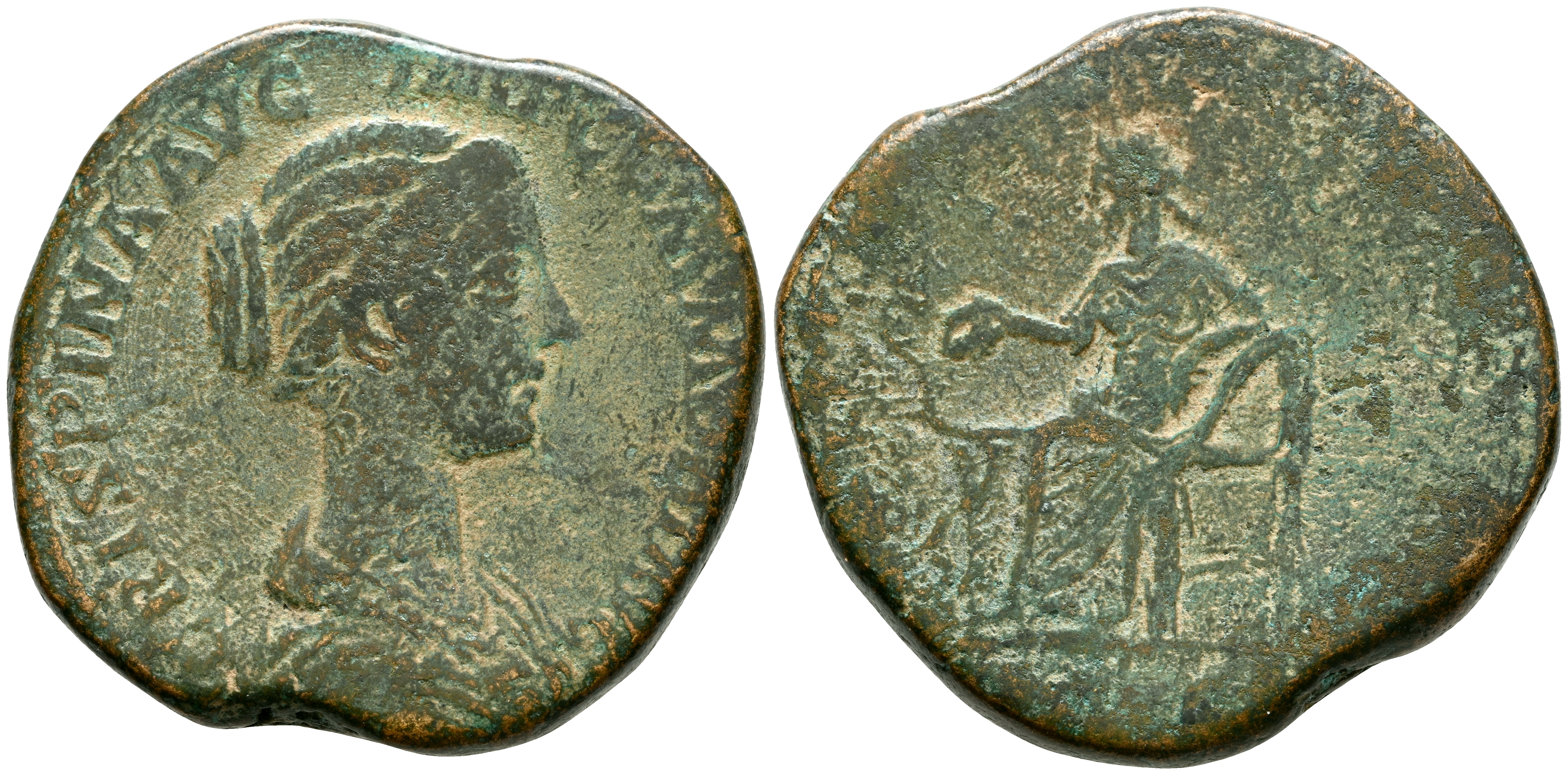 CRISPINA. Sestercio. (Ae. 18,11g/30mm). 178-182 d.C. Roma. (RIC 665). Anv: busto drapeado de Crispina a derecha, alrededor leyenda: CRISPINA AVGVSTA. Rev: Concordia sentada a izquierda portando patera y cornucopia, entre: S-C, alrededor leyenda: CONCORDIA. MBC-.