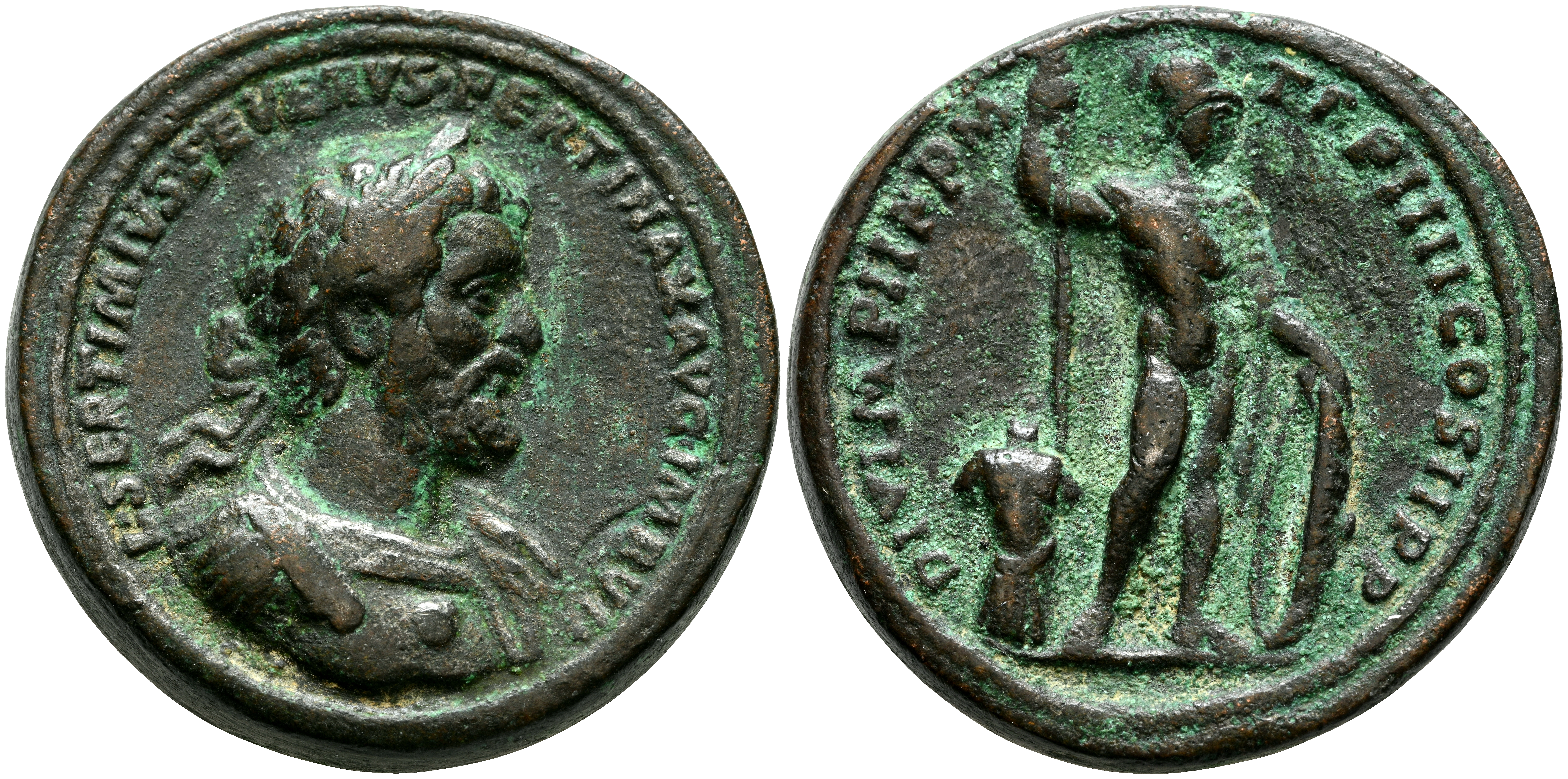 SEPTIMO SEVERO. Medallón Paduano. (Ae. 45,65g/38mm). Siglo XIX-XX. Roma. (Klawans 1) Anv: Busto laureado de Septimio Severo a derecha, alrededor leyenda: L SEPTIMIVS SEVERVS PERTINAX AVG IMP VII. Rev: Marte desnudo a derecha con manto, portando lanza y escudo, detrás coraza, alrededor leyenda: DIVI M P II FP M TR P IIII COS II PP. MBC.