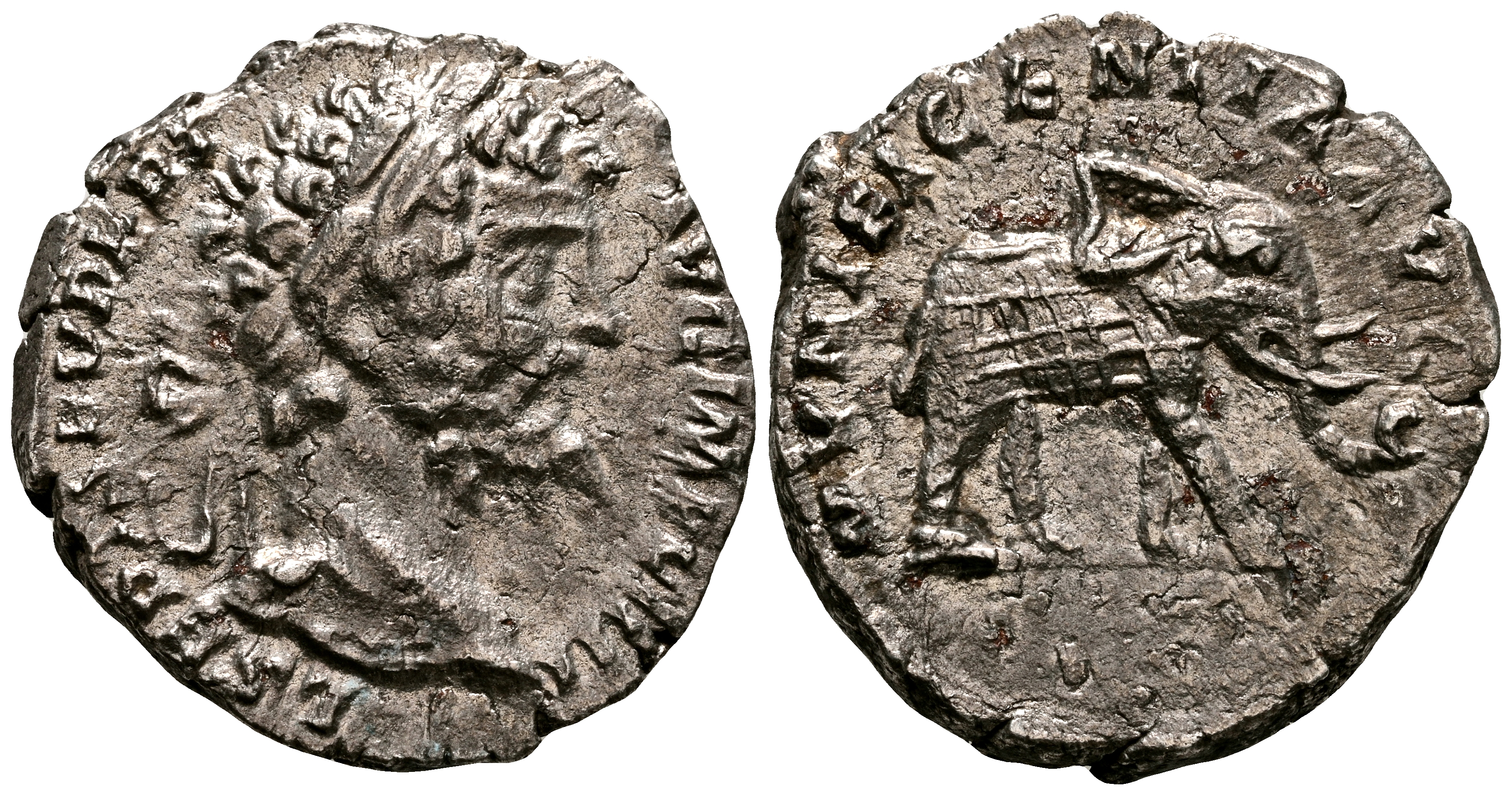 SEPTIMIO SEVERO. Denario. (Ar. 2,80g/17mm). 197 d.C. Roma. (RIC 100). Anv: Cabeza laureada de Septimio Severo a derecha, alrededor leyenda: L SEPT SEV PERT PROG IMP VIIII. Rev: Elefante con coraza a derecha, alrededor leyenda: MVNIFICENTIA AVG. MBC-.