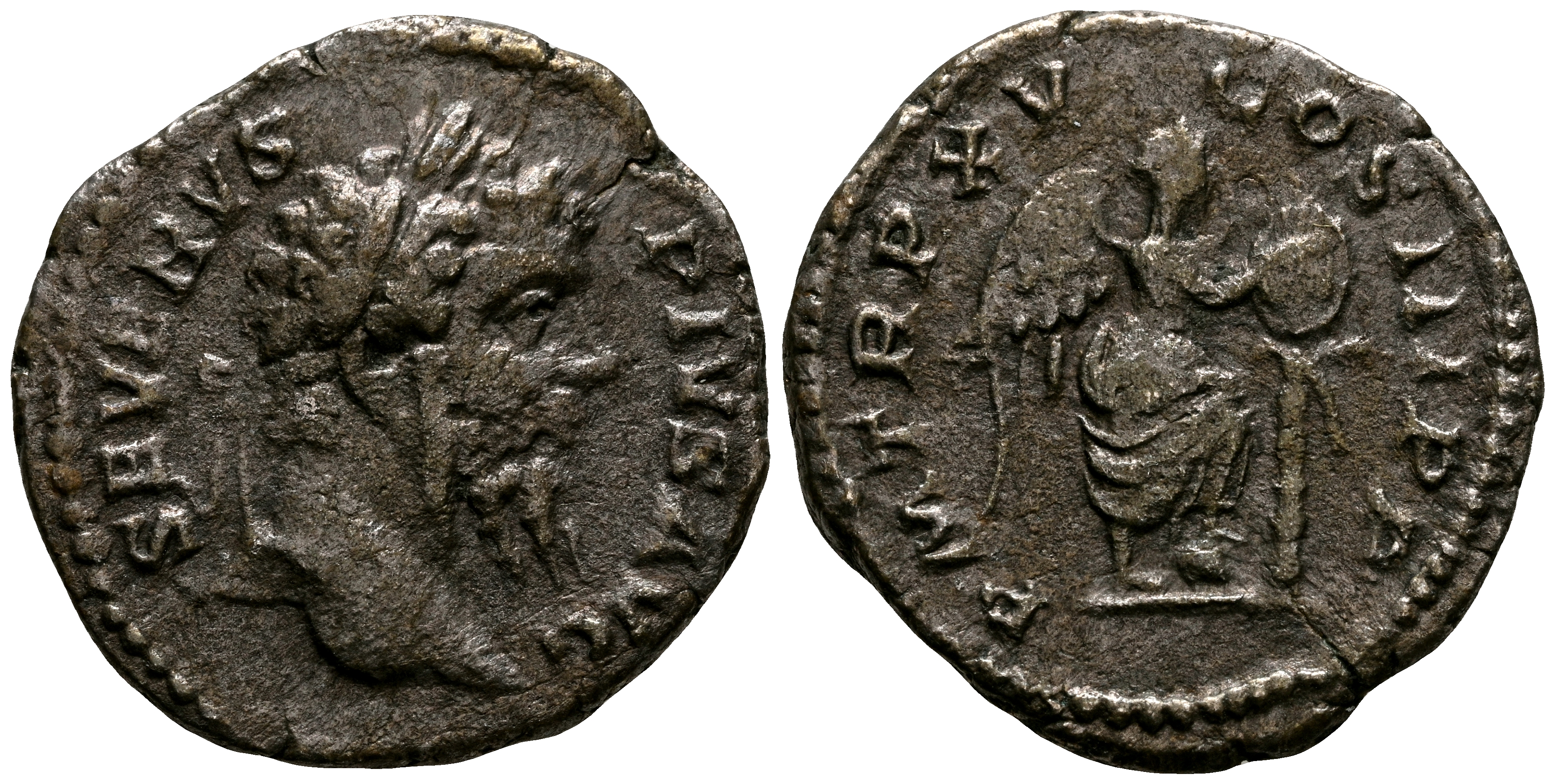 SEPTIMIO SEVERO. Denario. (Ar. 3,04g/19mm). 207 d.C. Roma. (RIC 211). Anv: Busto laureado de Septimio Severo a derecha, alrededor leyenda: SEVERVS PIVS AVG. Rev: Victoria estante a derecha con pie sobre globo, inscribiendo en un escudo sobre una palmera, alrededor leyenda: P M TR P XV COS III P P. MBC.
