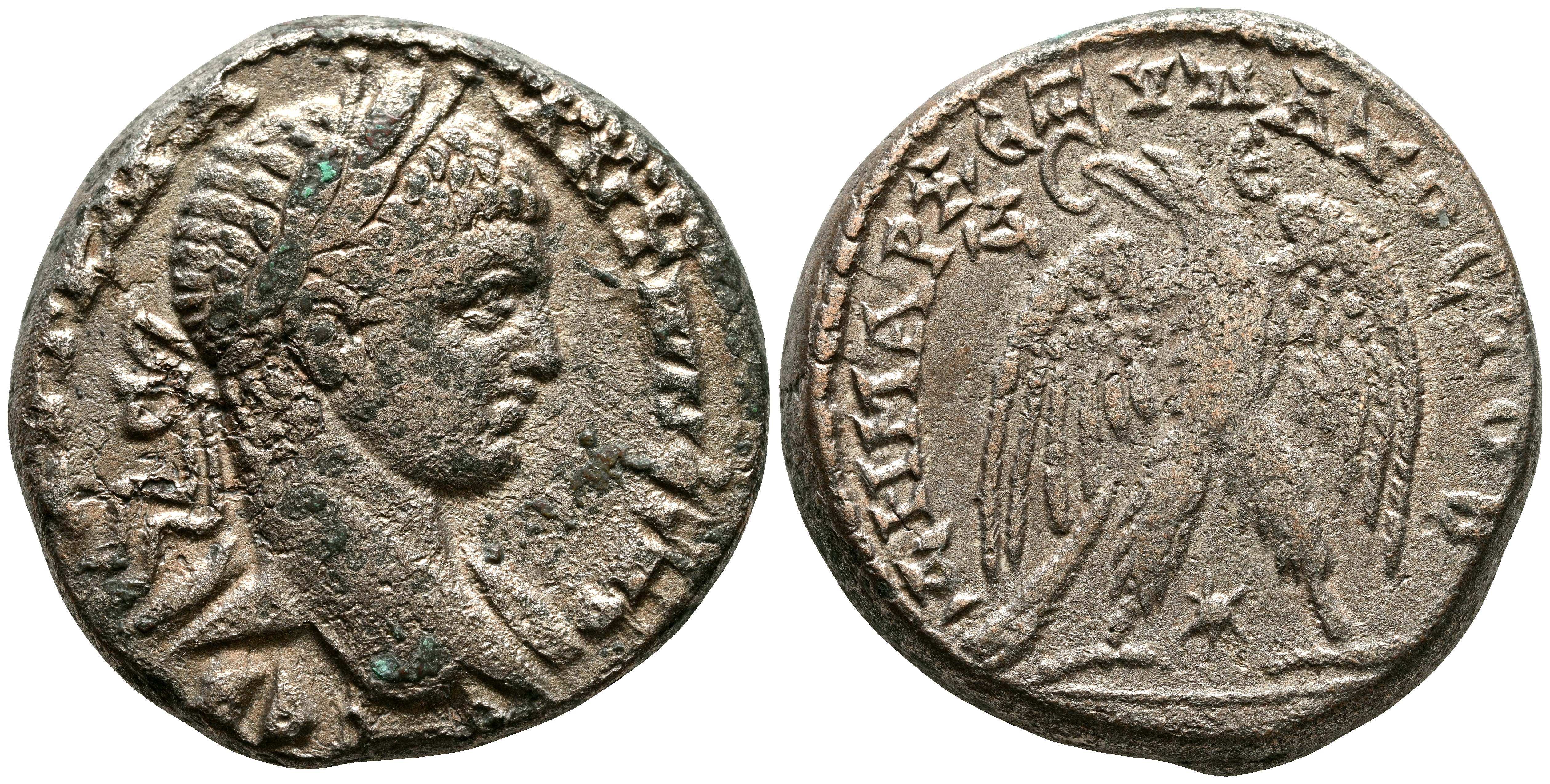CARACALLA. Tetradracma. (Ae. 14,40g/25mm). 215-217 d.C. Siria, Laodicea ad Mare. (Prieur 1179). Anv: Busto laureado a derecha, alrededor leyenda: AYT K M A ANTΩNЄINOC CЄB. Rev: Águila estante a izquierda con corona de laurel en el pico y estrella ent re las patas, alrededor leyenda: ΔΗΜΑΡX ЄΞ ΥΠΑΤΟC ΤΟ Δ. MBC.
