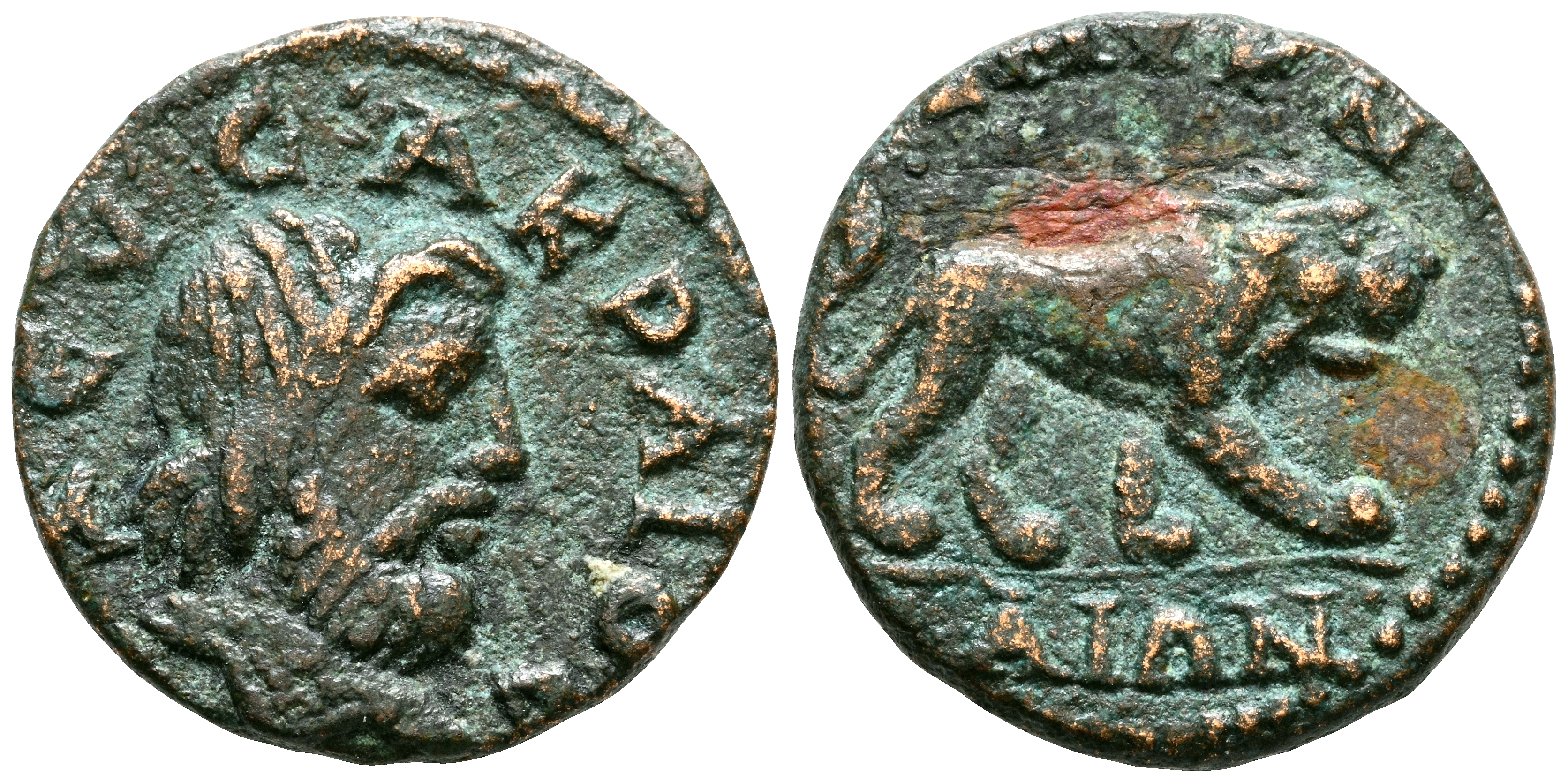 GORDIANO III, Acuñación pseudo-autónoma. Assarion. (Ae. 2,75g/17mm). 238-244 d.C. Jonia, Smyrna. (RPC 328). Anv: Cabeza de Zeus Akraios a derecha, alrededor leyenda: ΖЄΥϹ ΑΚΡΑΙΟϹ. Rev: León pasando a la derecha, alrededor leyenda: ϹΜΥΡΝΑΙΩΝ. MBC.