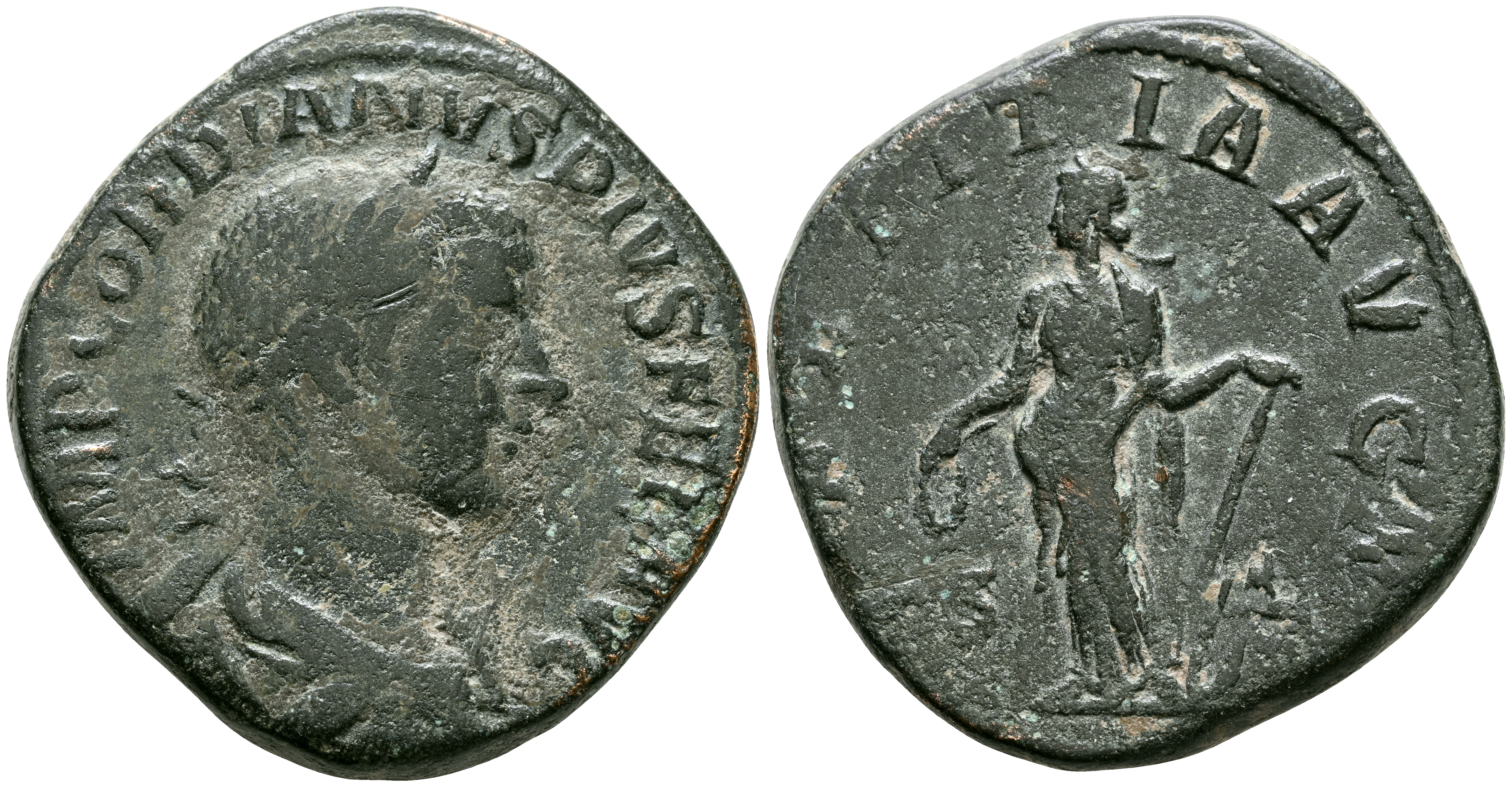 GORDIANO III. Sestercio. (Ae. 18,27g/30mm). 241-243 d.C. Roma. (RIC 300a). Anv: Busto laureado y drapeado de Gordiano III a derecha, alrededor leyenda: IMP GORDIANVS PIVS FEL AVG. Rev: Laetitia estante a izquierda portando corona de laurel y timón, entre: S-C, alrededor leyenda: LAETITIA AVG N. MBC-/BC+.