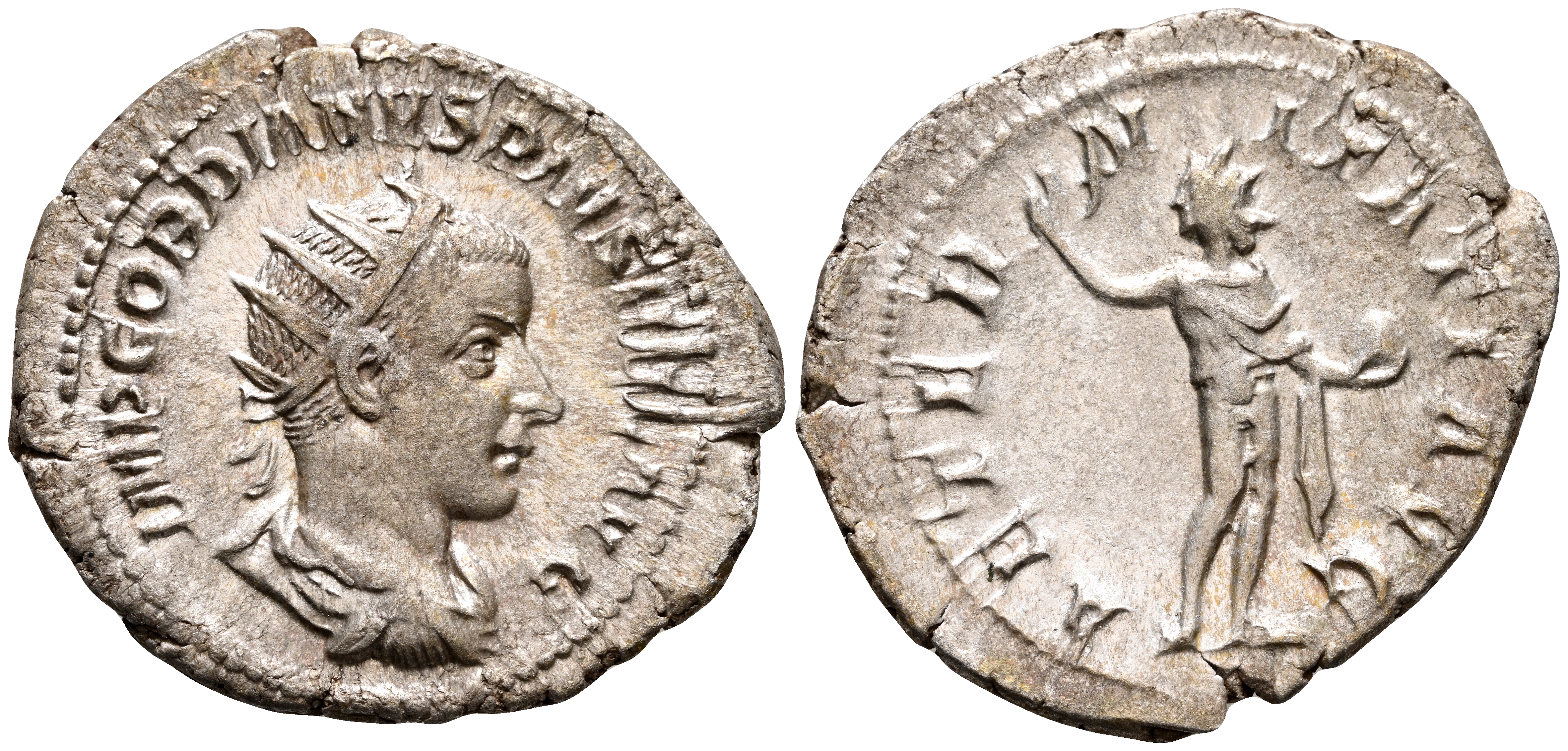 GORDIANO III. Antoniniano. (Ar. 3,41g/25mm). 241-243 d.C. Roma. (RIC 83). Anv: Busto radiado y drapeado de Gordiano III a derecha, alrededor leyenda: IMP GORDIANVS PIVS FEL AVG. Rev: Sol estante a izquierda alzando mano y portando globo, alrededor leyenda: AETERNITATI AVG. MBC.