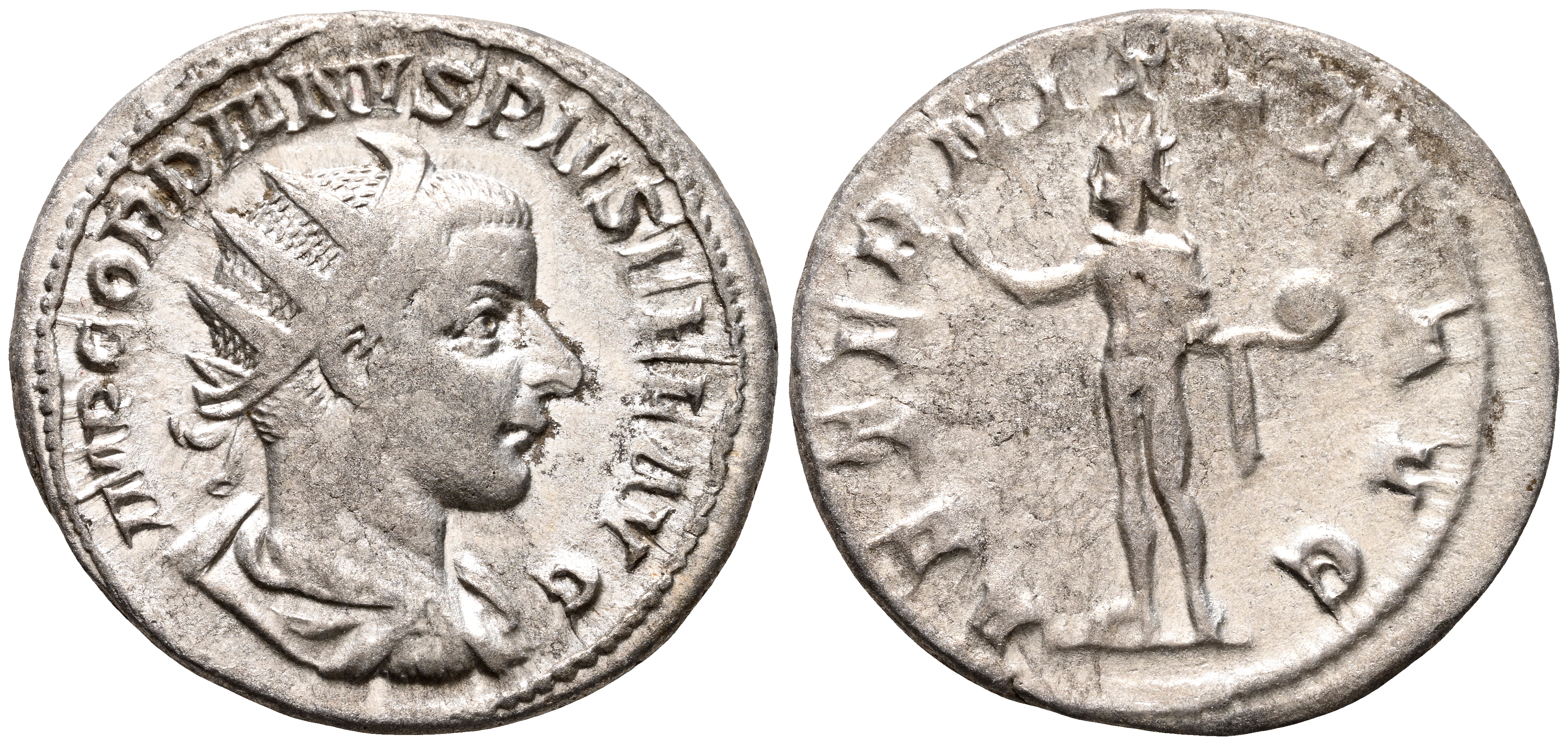 GORDIANO III. Antoniniano. (Ar. 7,07g/23mm). 241-243 d.C. Roma. (RIC 83). Anv: Busto radiado y drapeado de Gordiano III a derecha, alrededor leyenda: IMP GORDIANVS PIVS FEL AVG. Rev: Sol estante a izquierda alzando mano y portando globo, alrededor leyenda: AETERNITATI AVG. MBC.