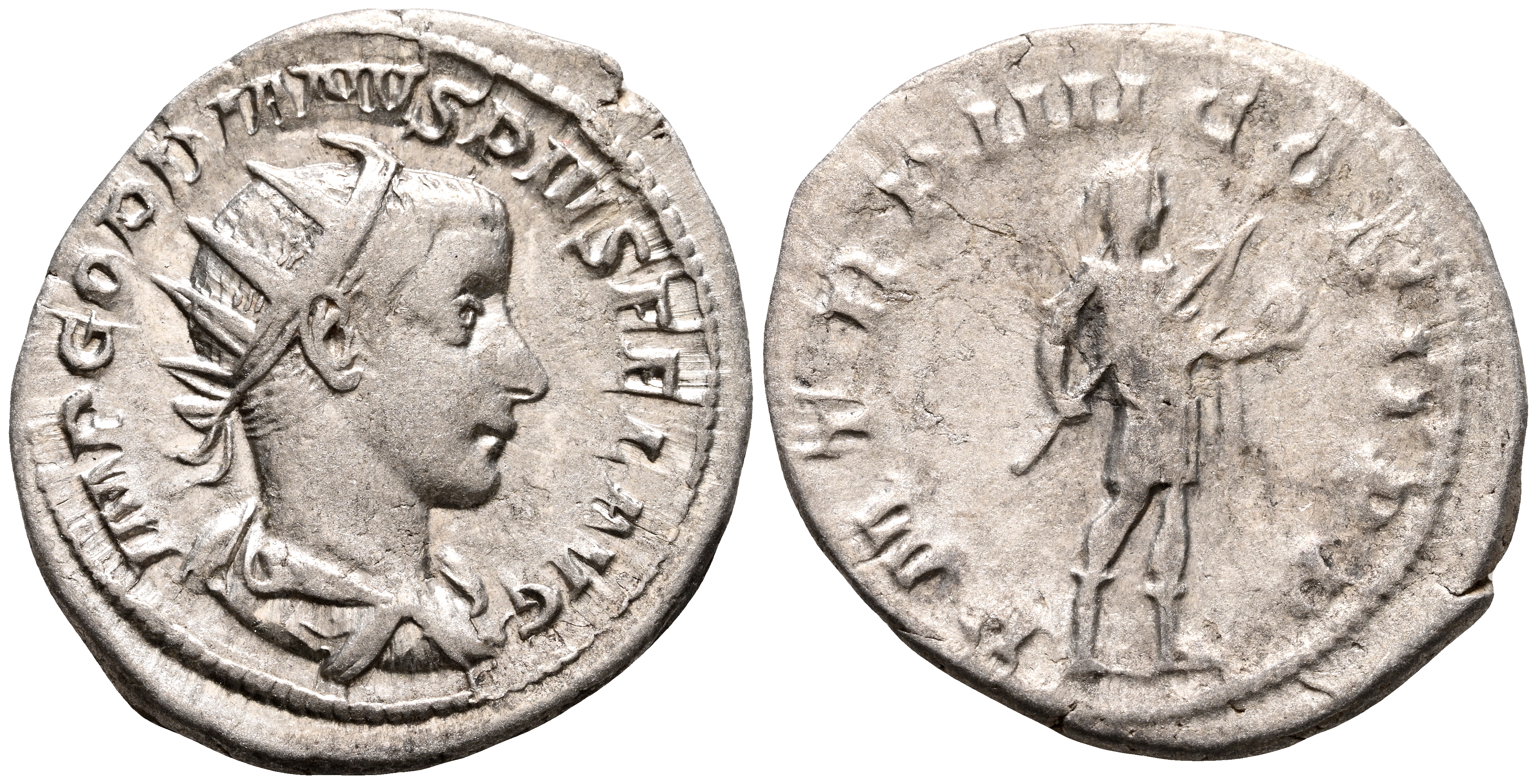GORDIANO III. Antoniniano. (Ar. 3,47g/23mm). 241-243 d.C. Roma. (RIC 92). Anv: Busto radiado y drapeado de Gordiano III a derecha, alrededor leyenda: IMP GORDIANVS PIVS FEL AVG. Rev: Gordiano III estante a derecha portando lanza y globo, alrededor leyenda: P M TR P IIII COS II P P. MBC+.