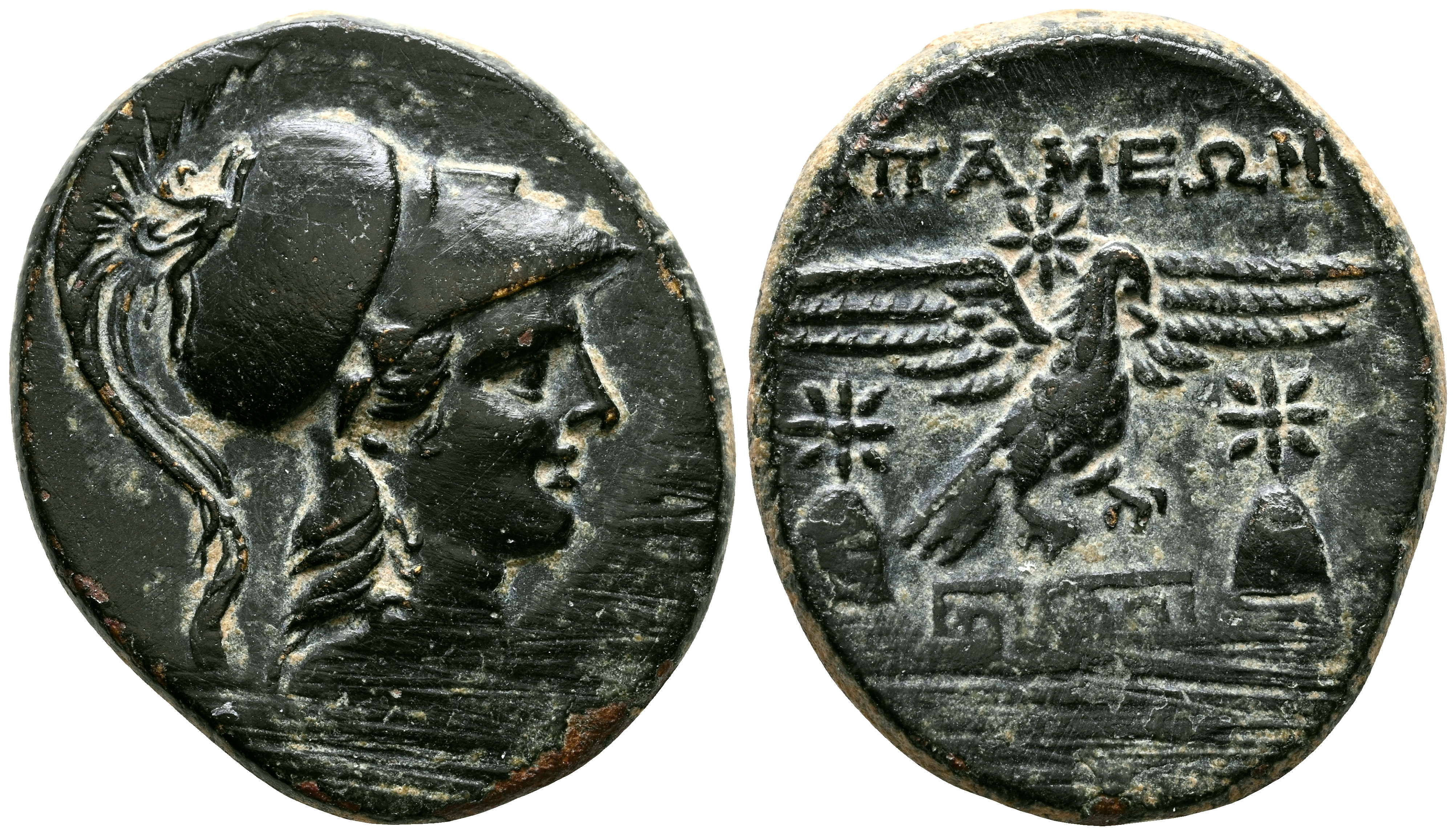 PHRYGIA, Apameia. Ae20. (Ae. 7,06g/23mm). 88-40 d.C. (SNG Copenhagen 164; HGC 7, 670). Anv: Busto de Atenas a derecha. Rev: Águila sobre decoración entre dos gorros de dioscuros con estrellas sobre ellos, encima: estrella, alrededor leyenda griega: Α ΠΑMEΩΝ / ANΔΡONIKOΥ / AΛKIOΥ. MBC+.