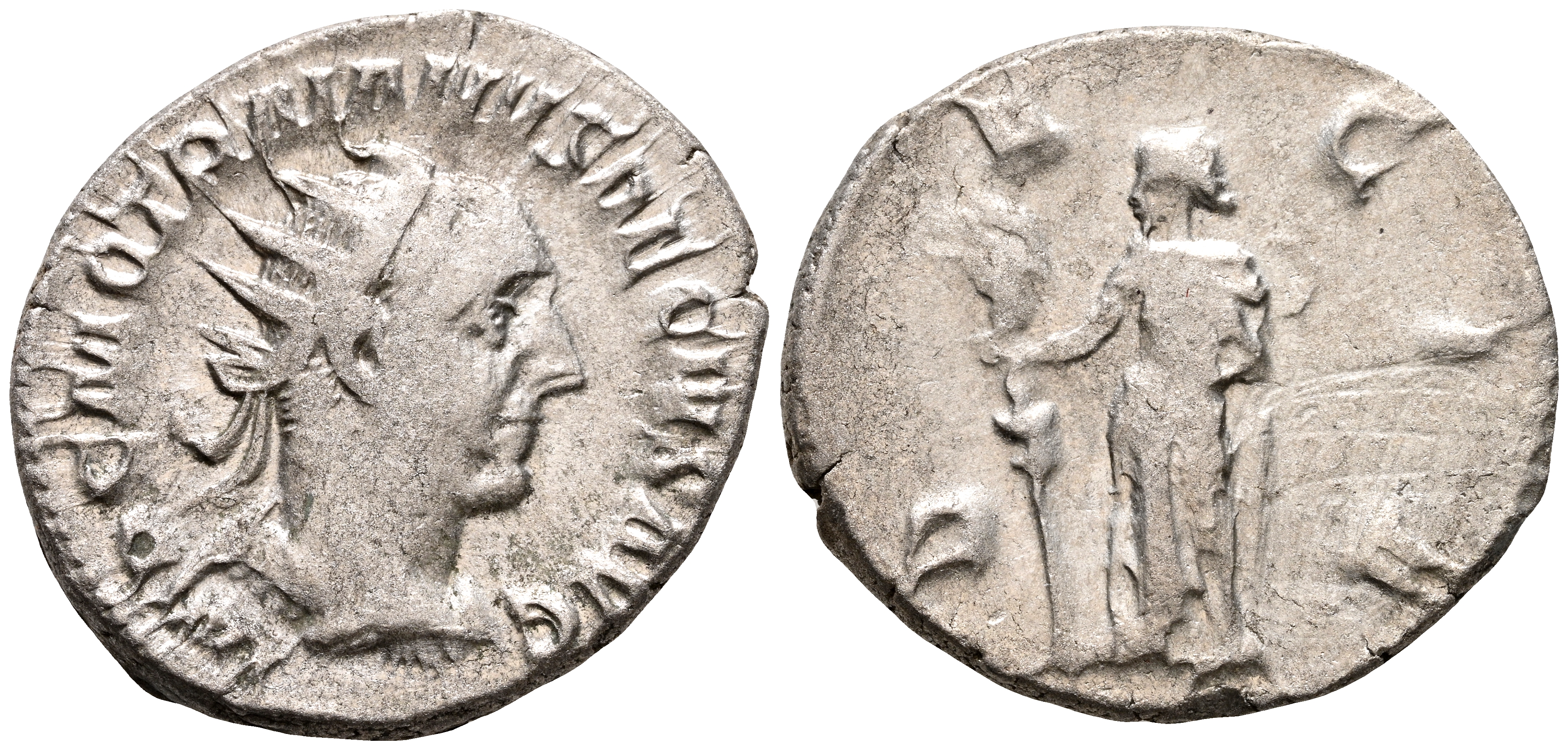 TRAJANO DECIO. Antoniniano. (Ar. 3,74g/21mm). 250-251 d.C. Roma. (RIC 12b). Anv: Busto radiado y drapeado de Trajano Decio a derecha, alrededor leyenda: IMP C M Q TRAIANVS DECIVS AVG. Rev: Dacia estante estante a izquierda portando cetro con cabeza de lobo (Draco) en el extremo, alrededor leyenda: DACIA. MBC.