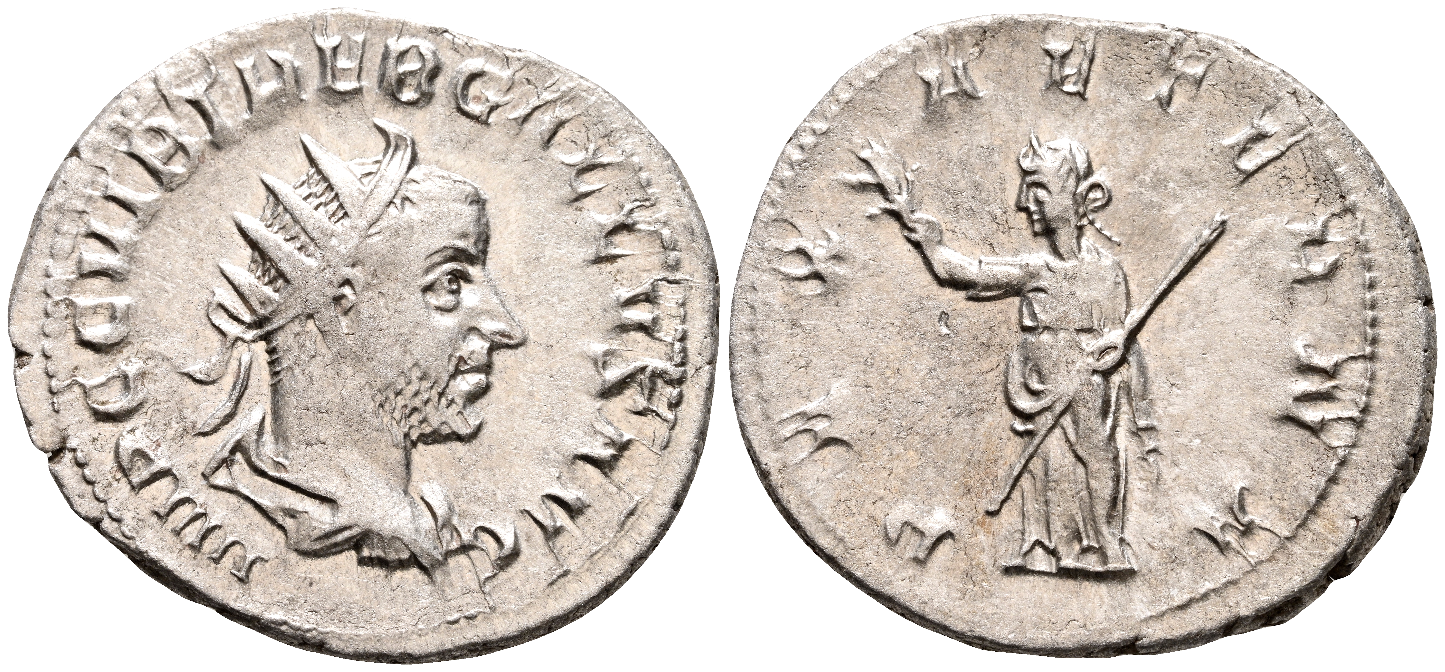 TREBONIANO GALO. Antoniniano. (Ar. 3,80g/24mm). 251-252 d.C. Roma. (RIC 71). Anv: Busto radiado y drapeado de Treboniano Galo a derecha, alrededor leyenda: IMP C C VIB TREB GALLVS AVG. Rev: Pax estante a izquierda portando rama y cetro, alrededor leyenda: PAX AETERNA. EBC-. Restos de brillo original.