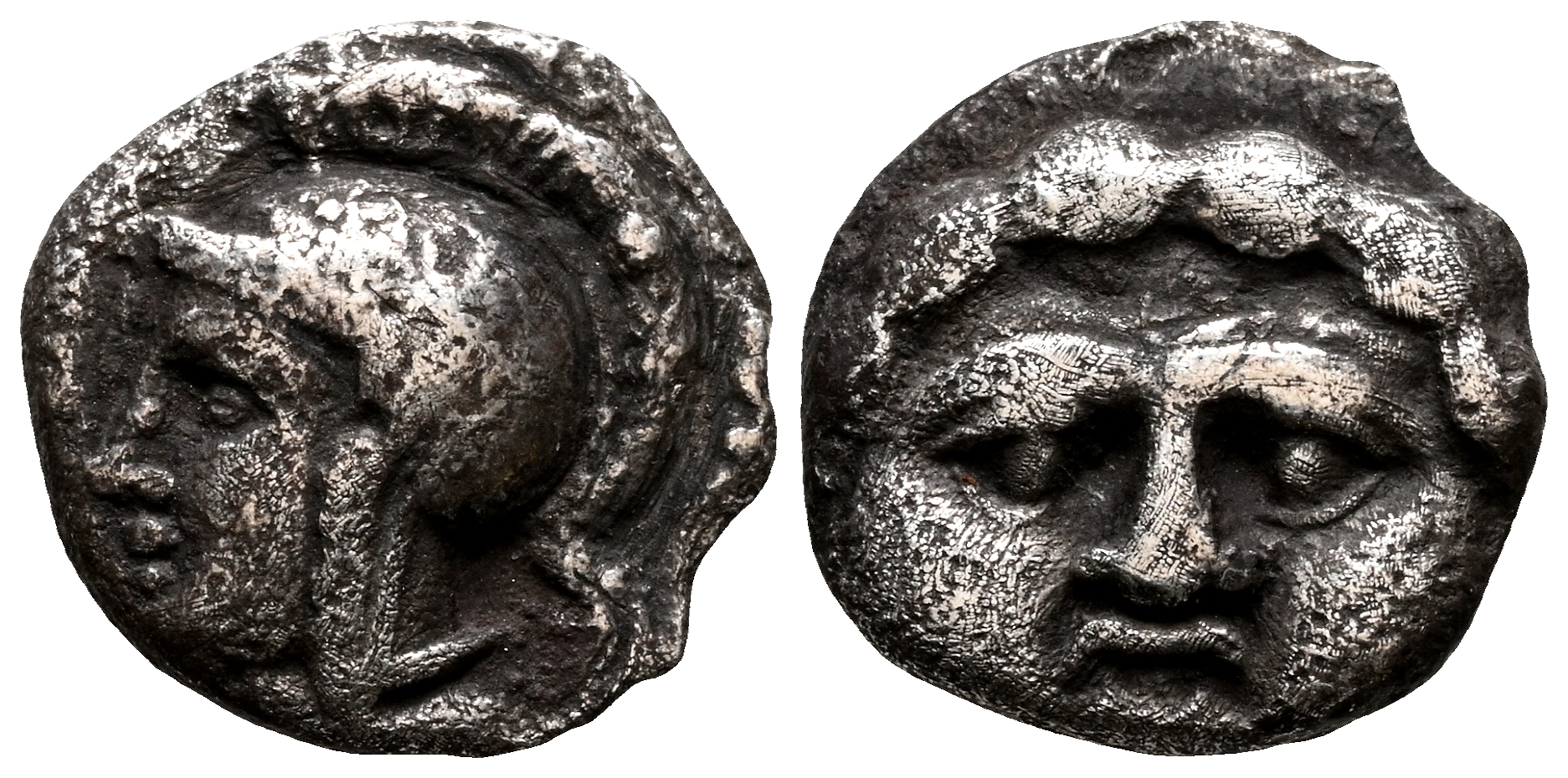 PISIDIA, Selge. Obolo. (Ar. 0,85g/9mm). 350-300 a.C. (SNG von Aulock 5278var). Anv: Gorgoneion de frente. Rev: Cabeza de Atenas con casco a izquierda, detrás astrágalos. MBC.