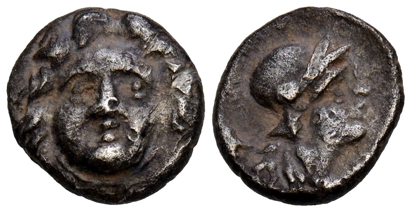 PISIDIA, Selge. Óbolo. (Ar. 1,07g/10mm). 350-300 a.C. (SNG BN 1933). Anv: Cabeza de frente de Gorgona. Rev: Cabeza con casco de Atenena a derecha, detrás punta de lanza. MBC.