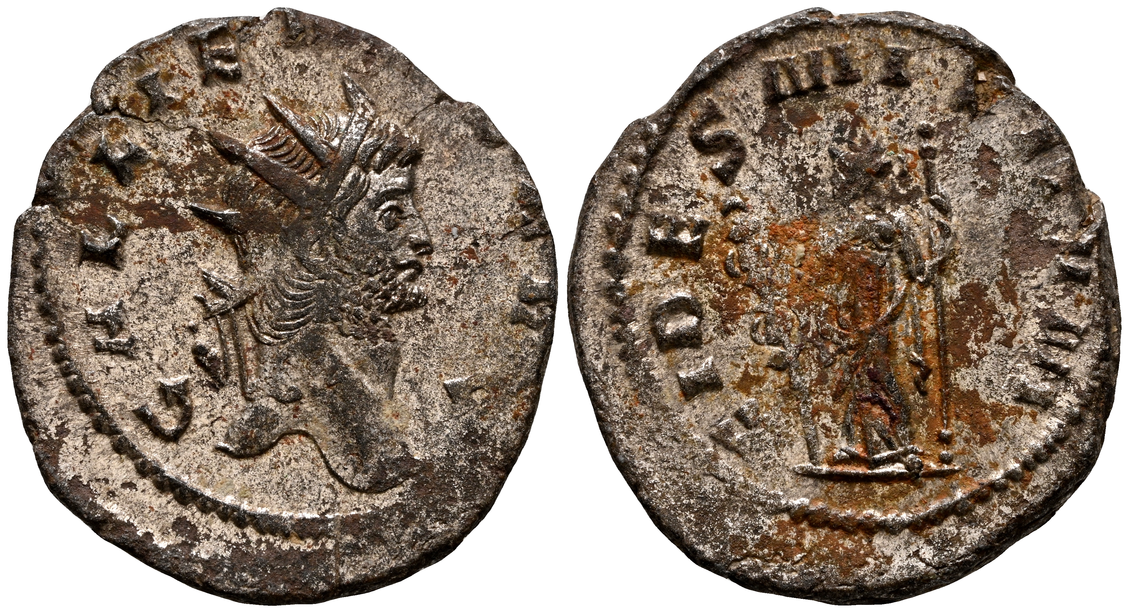 GALIENO. Antoniniano. (Ar. 2,80g/21mm). 267-268 d.C. Roma. (RIC 192a). Anv: Cabeza radiada de Galieno a derecha, alrededor leyenda: GALLIENVS AVG. Rev: Fides estante a izquierda portando dos estandartes, alrededor leyenda: FIDES MILITVM. MBC+.
