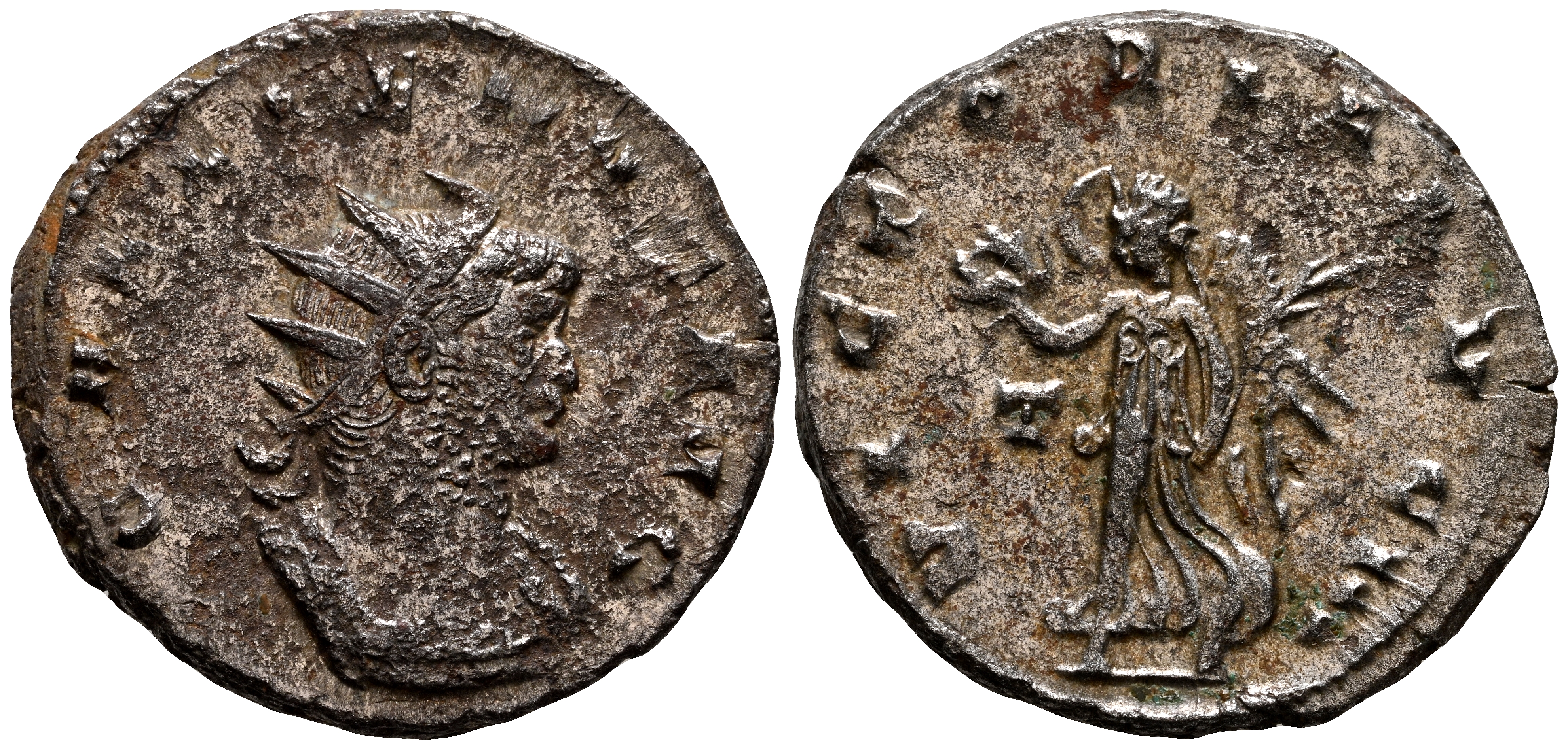 GALIENO. Antoniniano. (Ar. 3,60g/21mm). 260-261 d.C. Roma. (RIC 305). Anv: Busto radiado y con coraza de Galieno a derecha, alrededor leyenda: GALLIENVS AVG. Rev: Victoria avanzando a izquierda portando palma y corona de laurel, en campo: T, alrededor leyenda: VICTORIA AVG III. MBC.