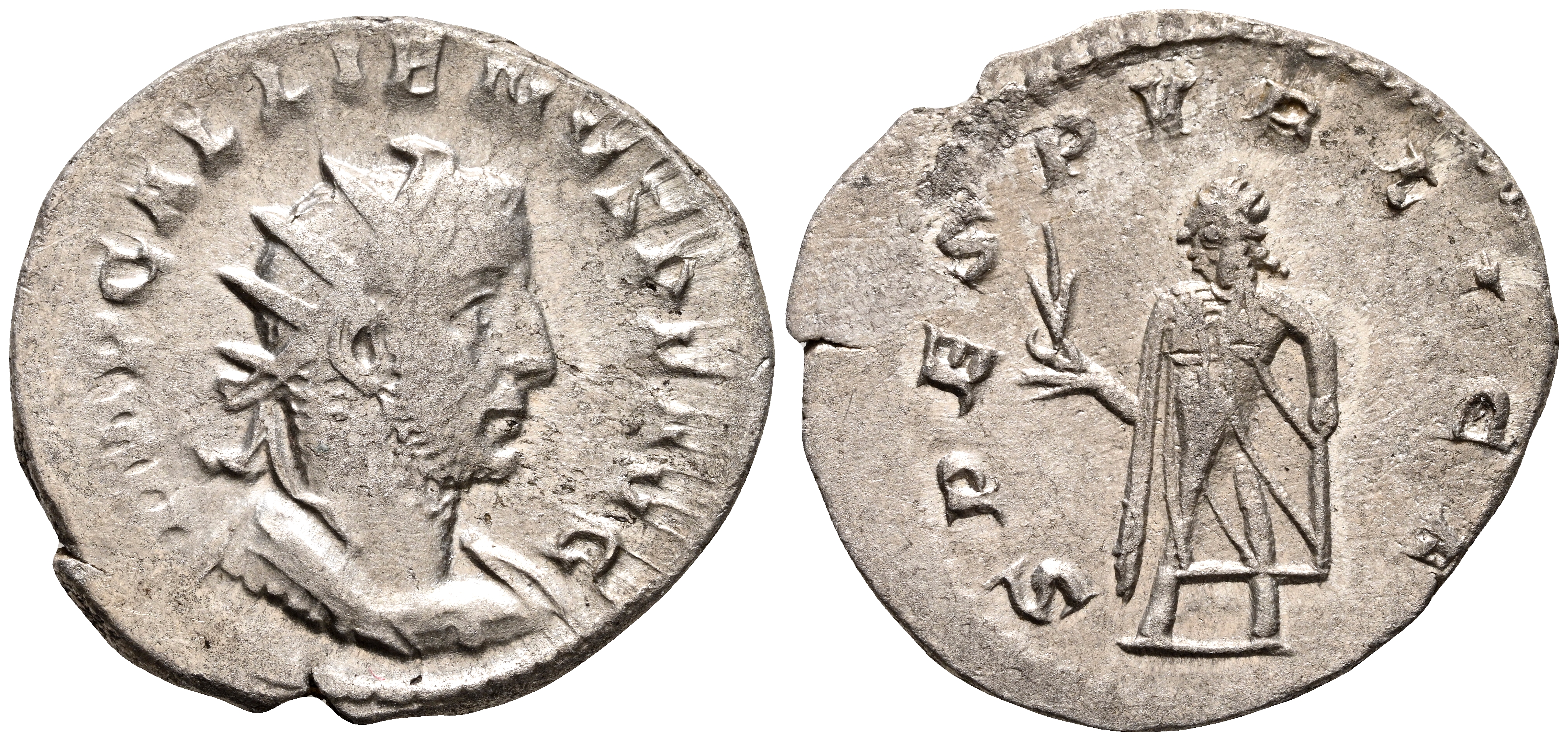 GALIENO. Antoniniano. (Ar. 2,92g/22mm). 257 d.C. Mediolanum. (RIC 403 var). Anv: Busto radiado y con coraza de Galieno a derecha, alrededor leyenda: IMP GALLIENVS P F AVG. Rev: Spes avanzando a izquierda portando flor, alrededor leyenda: SPES PVBLICA. MBC+. Variante de leyenda en anverso.