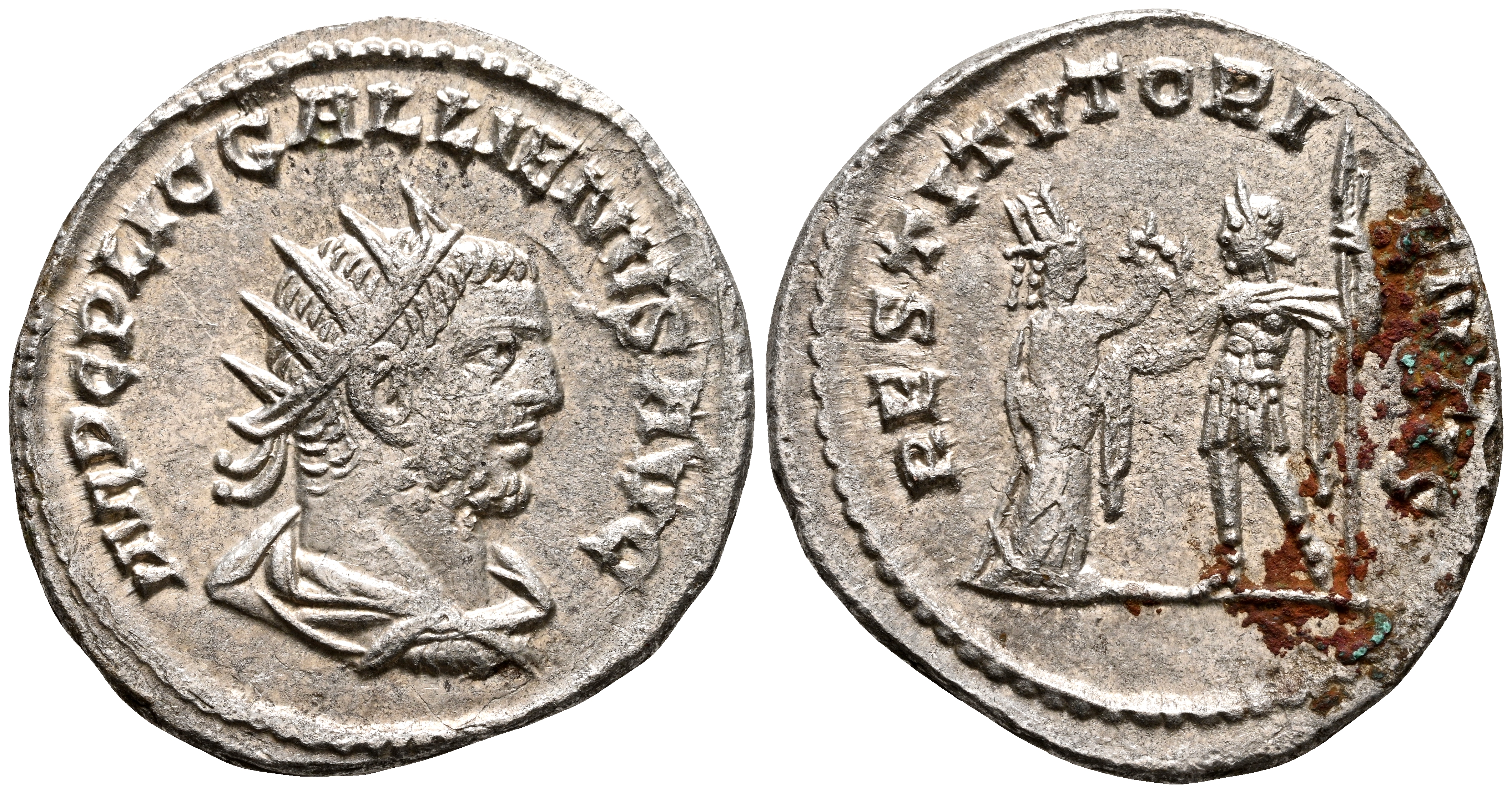 GALIENO. Antoniniano. (Ar. 3,21g/22mm). 255-256 d.C. Somosata. (RIC 448). Anv: Busto radiado y con coraza a derecha de Galieno, alrededor leyenda: IMP C P LIC GALLIENVS AVG. Rev: Figura femenina estante a derecha coronando Galieno estante a izquierda portando cetro, alrededor leyenda: RESTITVT ORIENTIS. MBC+. Depósitos en reverso.