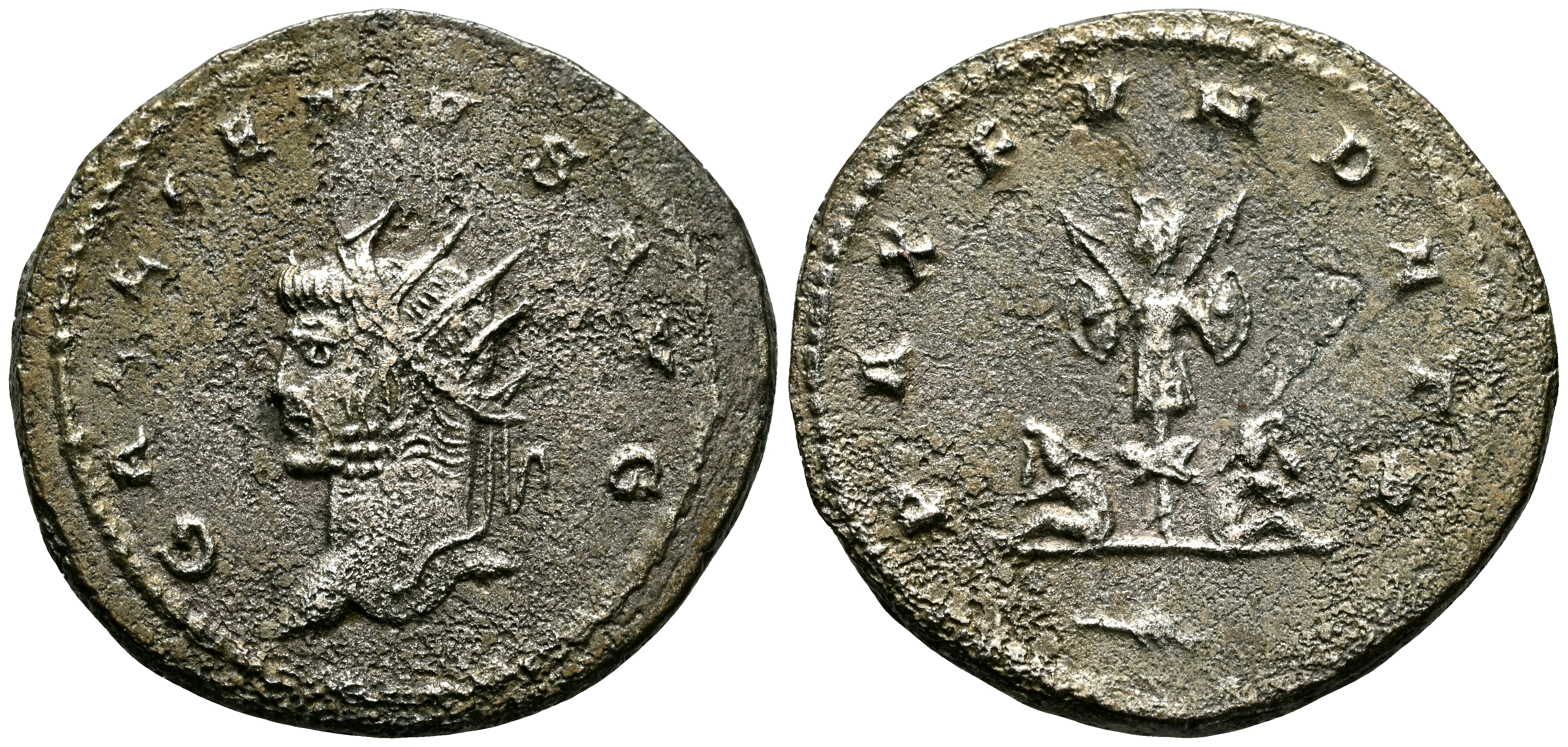 GALIENO. Antoniniano. (Ve. 3,96g/22mm). 264-265 d.C. Antioquía. (RIC 652). Anv: Busto radiado de Galieno a la izquierda, alrededro leyenda: GALLIENVS AVG. Rev: Trofeo entre dos cautivos sentados en el suelo, en exergo rama hacia la derecha, alrededor leyenda: PAX FVNDATA. MBC. Porosidad.
