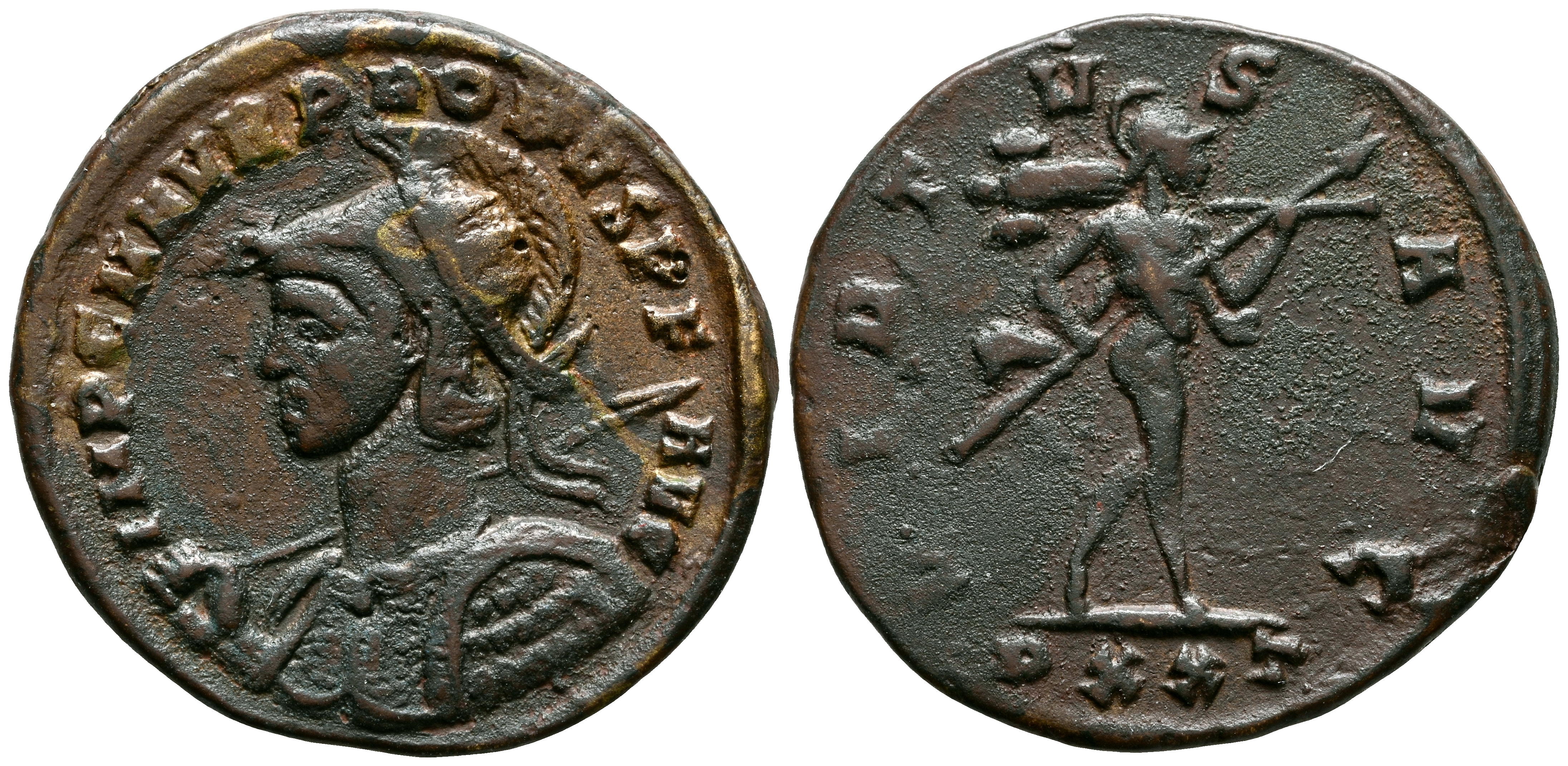 PROBO. Antoniniano. (Ae. 3,31g/22mm). 276-282 d.C. Ticinum. (RIC 430). Anv: Busto con casco y coraza de Probo a izquierda portando lanza y escudo, alrededor leyenda: IMP C M AVR PROBVS PF AVG. Rev: Marte avanzando a derecha portando trofeo y lanza, en exergo: PXXT, alrededor leyenda: VIRTVS AVG. MBC.