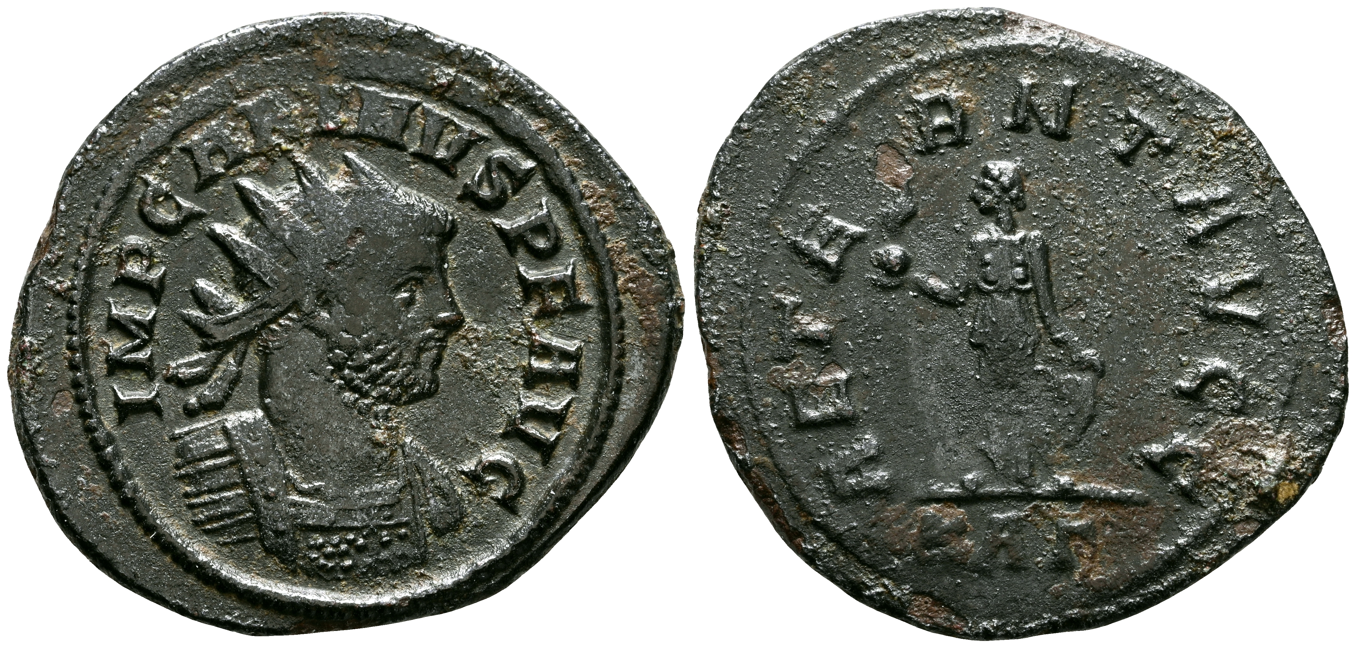 CARINO. Antoniniano. (Ae. 3,16g/24mm). 283-285 d.C. Roma. (RIC 248var). Anv: Busto radiado, drapeado y con coraza de Carino a derecha, alrededor leyenda: IMP CARINVS P F AVG. Rev: Aeternitas estante a izquierda portando Fenix sobre globo, en exergo: KAΓ, alrededor leyenda: AETE RNT AVGG. MBC. Escaso ejemplar.