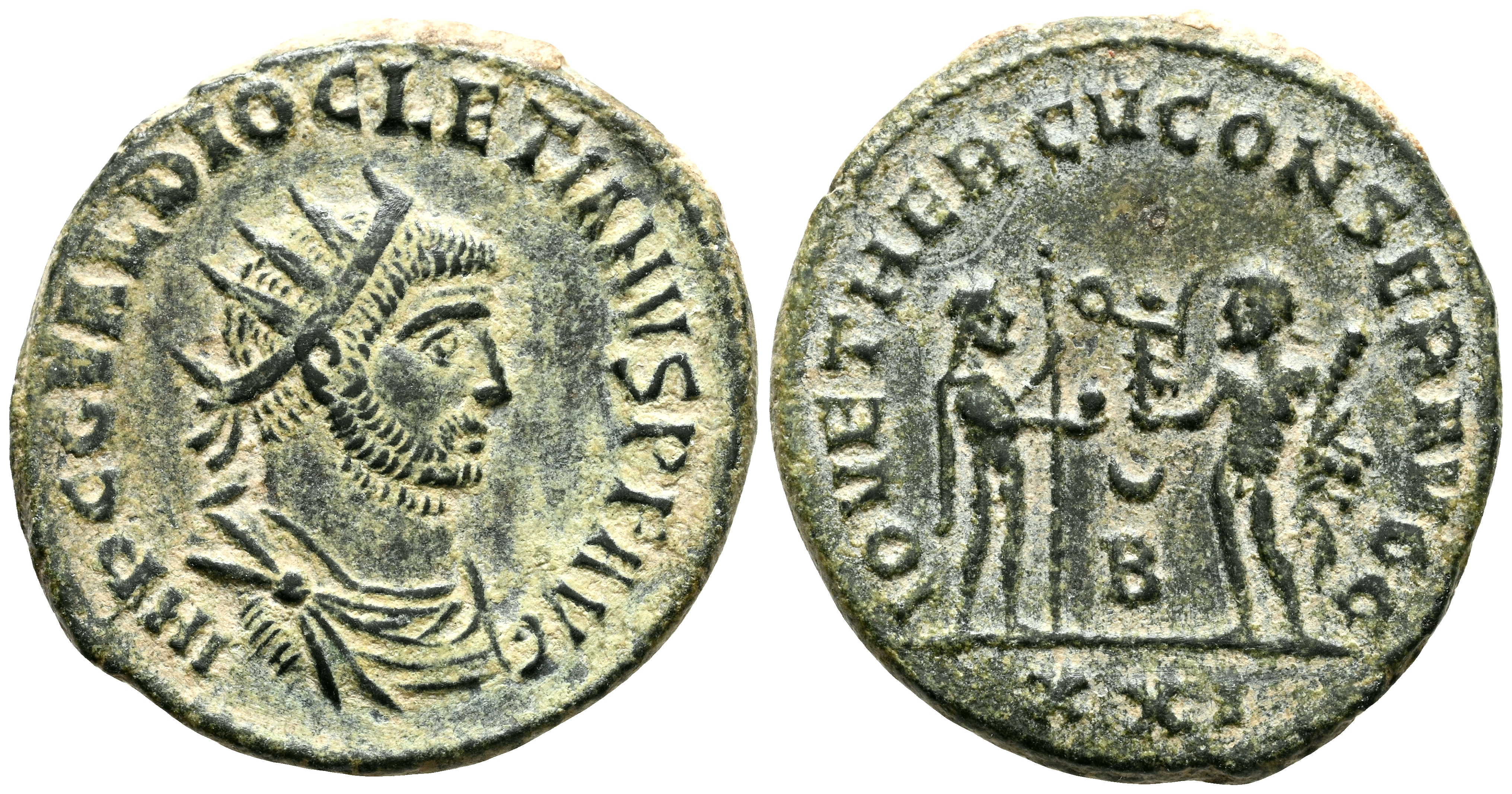 DIOCLECIANO. Antoniniano. (Ae. 4,40g/22mm). 285 d.C. Antioquía. (RIC 323). Anv: Busto radiado y con coraza de Diocleciano a derecha, alrededor leyenda: IMP C C VAL DIOCLETIANVS P F AVG. Rev: Júpiter estante a derecha portando lanza y globo enfrentado a Hércules estante a izquierda portando Victoria con corona de laurel, mazo y piel de león, entre ellos, creciente y B, en exergo: XXI, alrededor leyenda: IOV ET HERCV CONSER AVGG. MBC+.