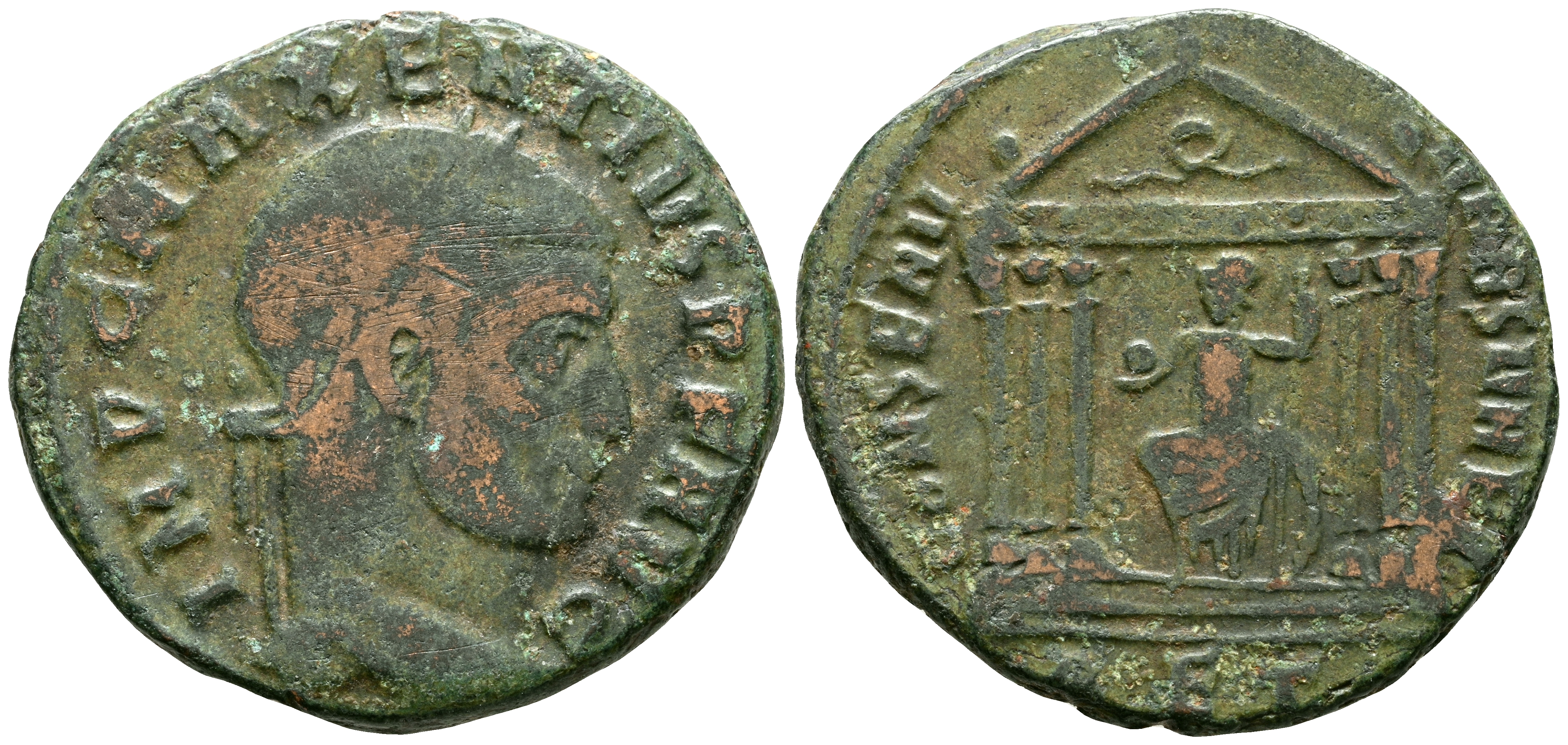MAJENCIO. Follis. (Ae. 5,59g/24mm). 310-311 d.C. Roma. (RIC 258). Anv: Cabeza laureada de Majencio a derecha, alrededor leyenda: IMP C MAXENTIVS P F AVG. Rev: Roma sentada a izquierda portando lanza y globo dentro de templo hexástilo, en exergo: RET, alrededor leyenda: CONSERV VRB SVAE. MBC.
