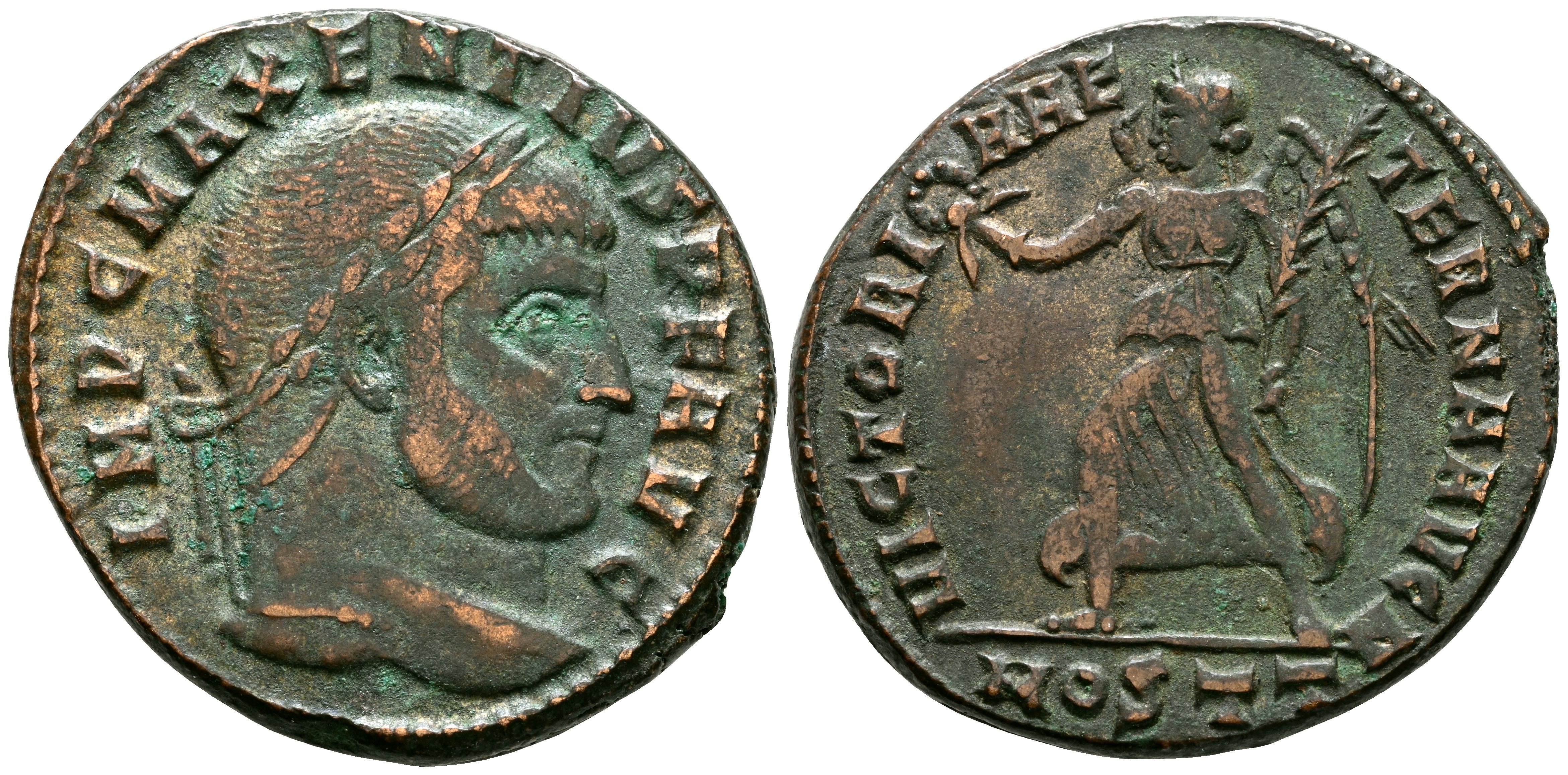 MAJENCIO. Follis. (Ae. 6,64g/24mm). 309-312 d.C. Ostia. (RIC 54). Anv: Cabeza laureada de Majencio a derecha, alrededor leyenda: IMP C MAXENTIVS P F AVG. Rev: Victoria avanzando a izquierda portando corona de laurel y palma, en exergo: MOSTT, alrededor leyenda: VICTORIA AETERNA AVG. MBC.