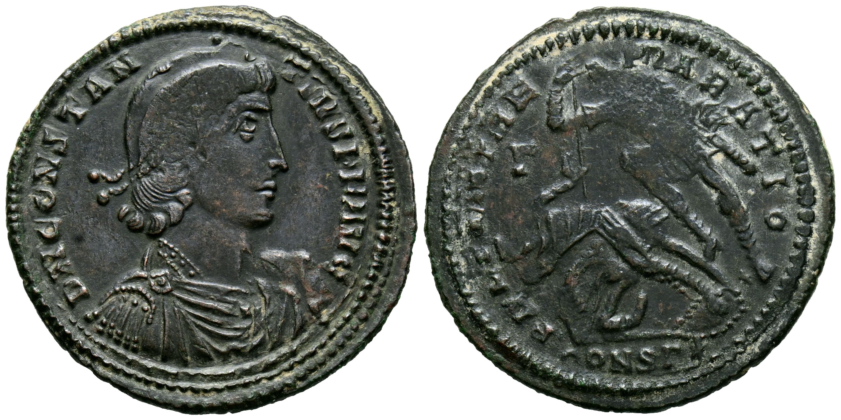 CONSTANCIO II. Maiorina. (Ae. 4,24g/25mm). 348-351 d.C. Constantinopla. (RIC 48). Anv: Busto diademado, drapeado y acorazado de Constantino II a derecha, alrededor leyenda: D N CONSTANTIVS P F AVG. Rev: Soldado con casco a izquierda escudo en el brazo izquierdo y alanceando a un jinete caído, en campo: r, en exergo: CONSr*, alrededor leyenda: FEL TEMP REPARATIO. MBC+. Interesante ejemplar.