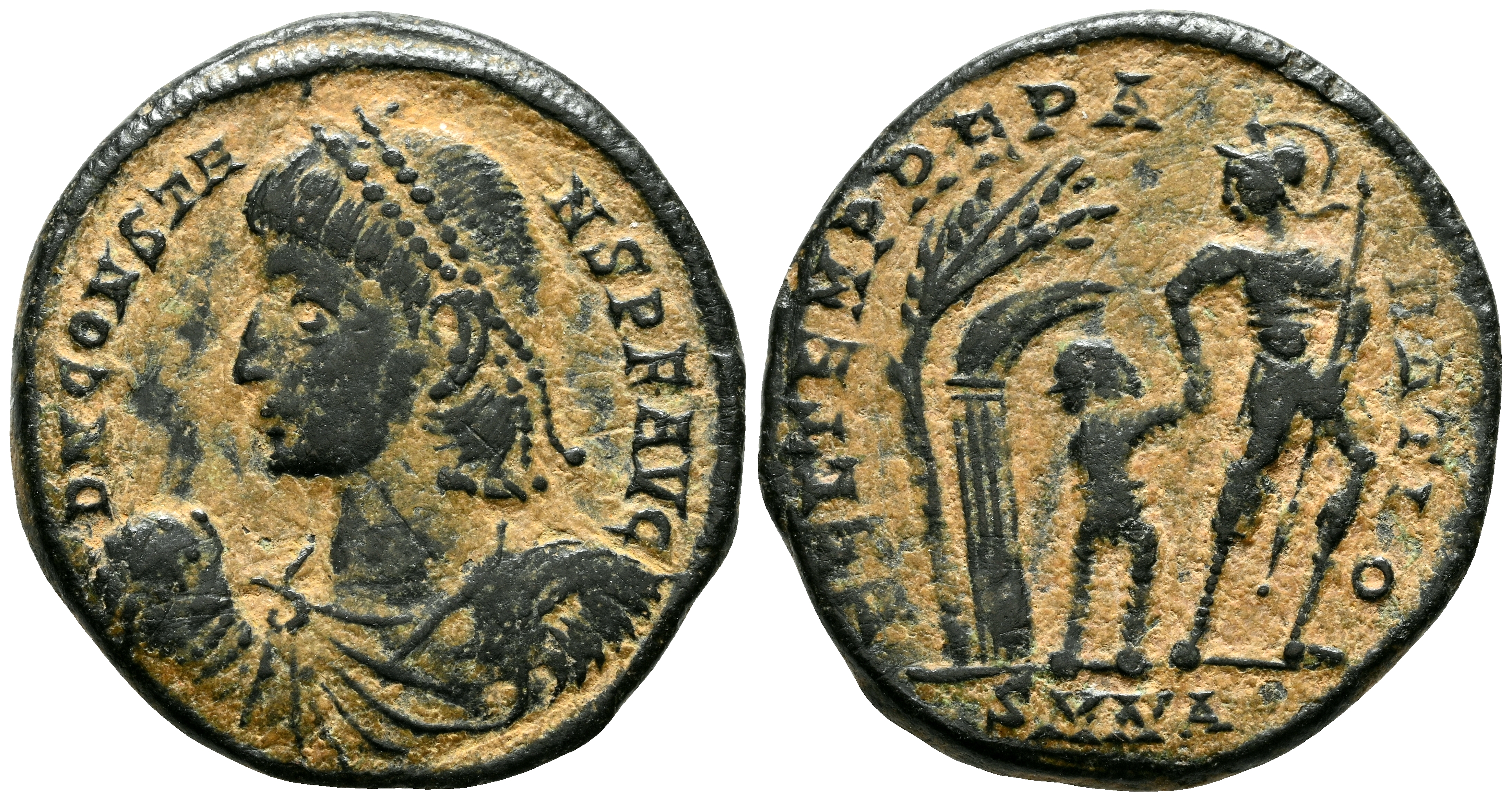 CONSTANTE. Follis. (Ae. 3,89g/21mm). 348-349 d.C. Nicomedia. (RIC 70). Anv: Busto diademado, drapeado y con coraza de Constans a izquierda portando globo. Rev: Soldado avanzando a derecha mirando a niño agarrado de la mano y portando lanza, ambos bajo palmera, en exergo: SMNA, alrededor leyenda: FEL TEMP REPARATIO. MBC-.