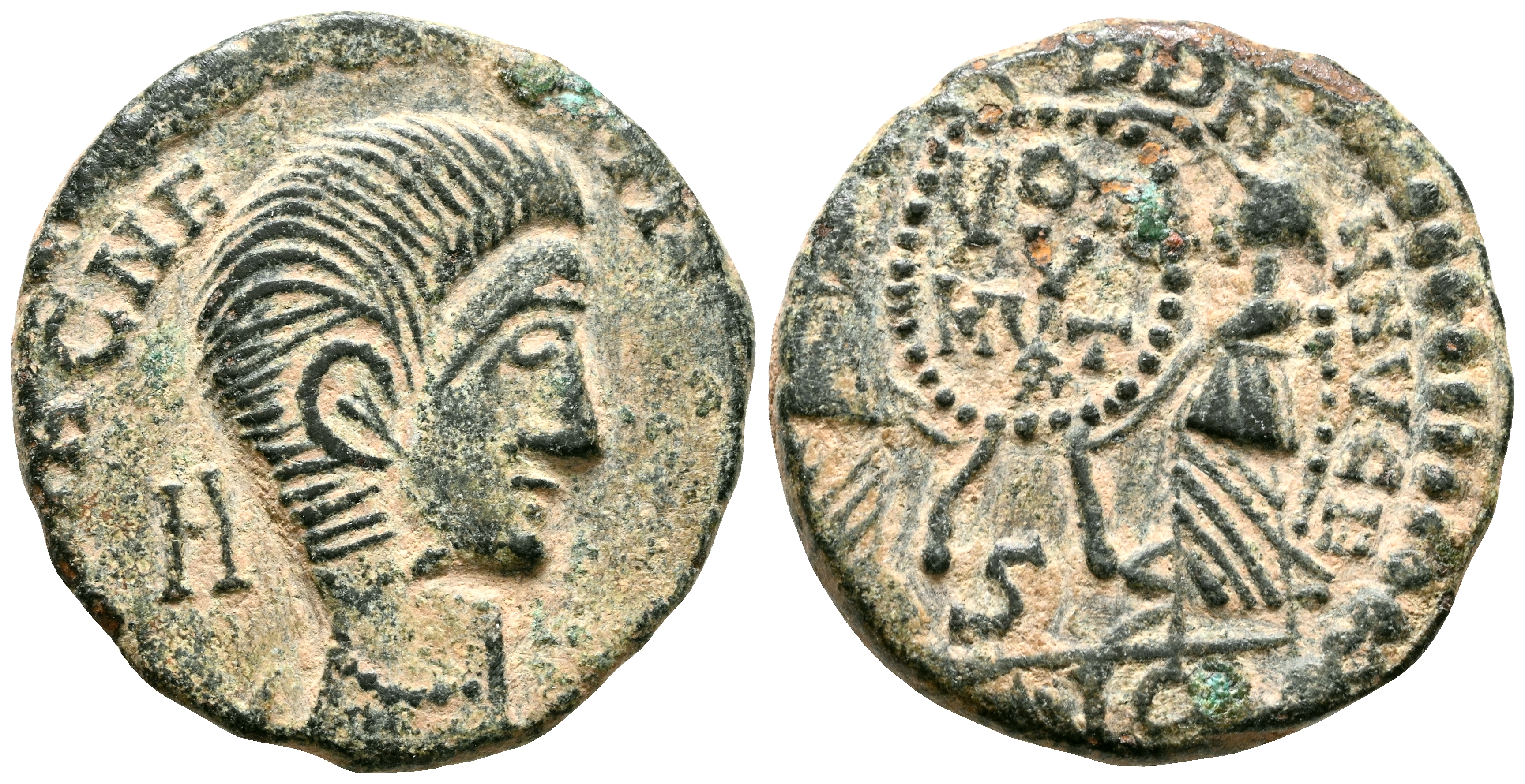 MAGNENCIO. 1/2 Maiorina. (Ae. 2,64g/18mm). 351-353 d.C. ¿Lugdunum?. (RIC tipo 123). Anv: Busto drapeado y con coraza de Magnencio a derecha, detrás: H, alrededor leyenda: D N MAGNENTIVS P F AVG. Rev: Dos Victorias enfrentadas portando escudo con inscripción: VOT /V/MVLT/X, entre ellas: S, en exergo: IC, alrededor leyenda: VICT DD NN VG E. MBC+.