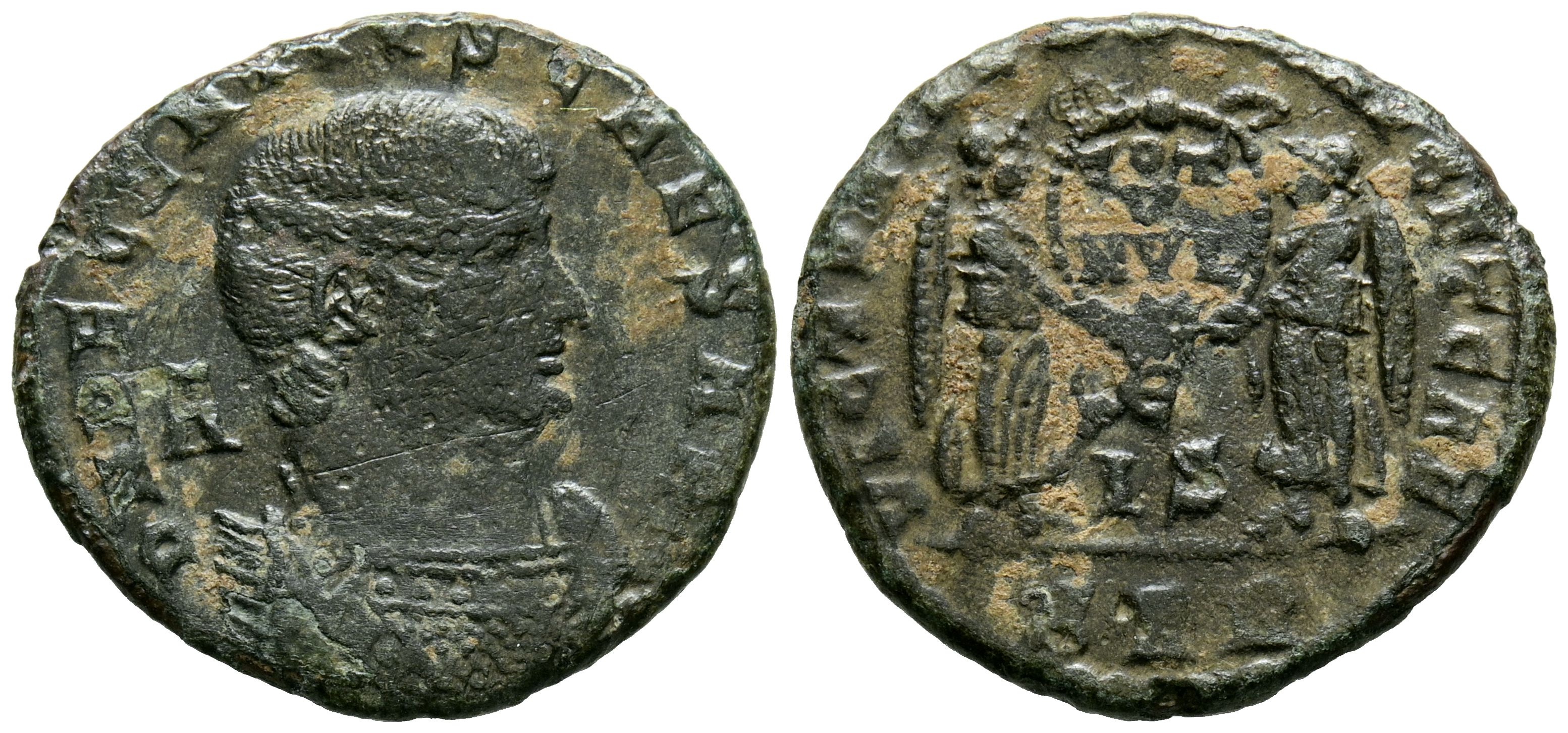 DECENCIO. Follis. (Ae. 3,35g/21mm). 351-352 d.C. Arles. (RIC 180). Anv: Busto drapeado de Decencio a derecha, detrás: A, alrededor leyenda: D N DECENTIVS CAESAR. Rev: Dos Victorias enfrentadas portando escudo con inscripción: VOT/V/MVLT/X, entre E/IS, en exergo: PAR, alrededor leyenda: VICTORIAE D D N N AVG ET CAES. MBC-/MBC.