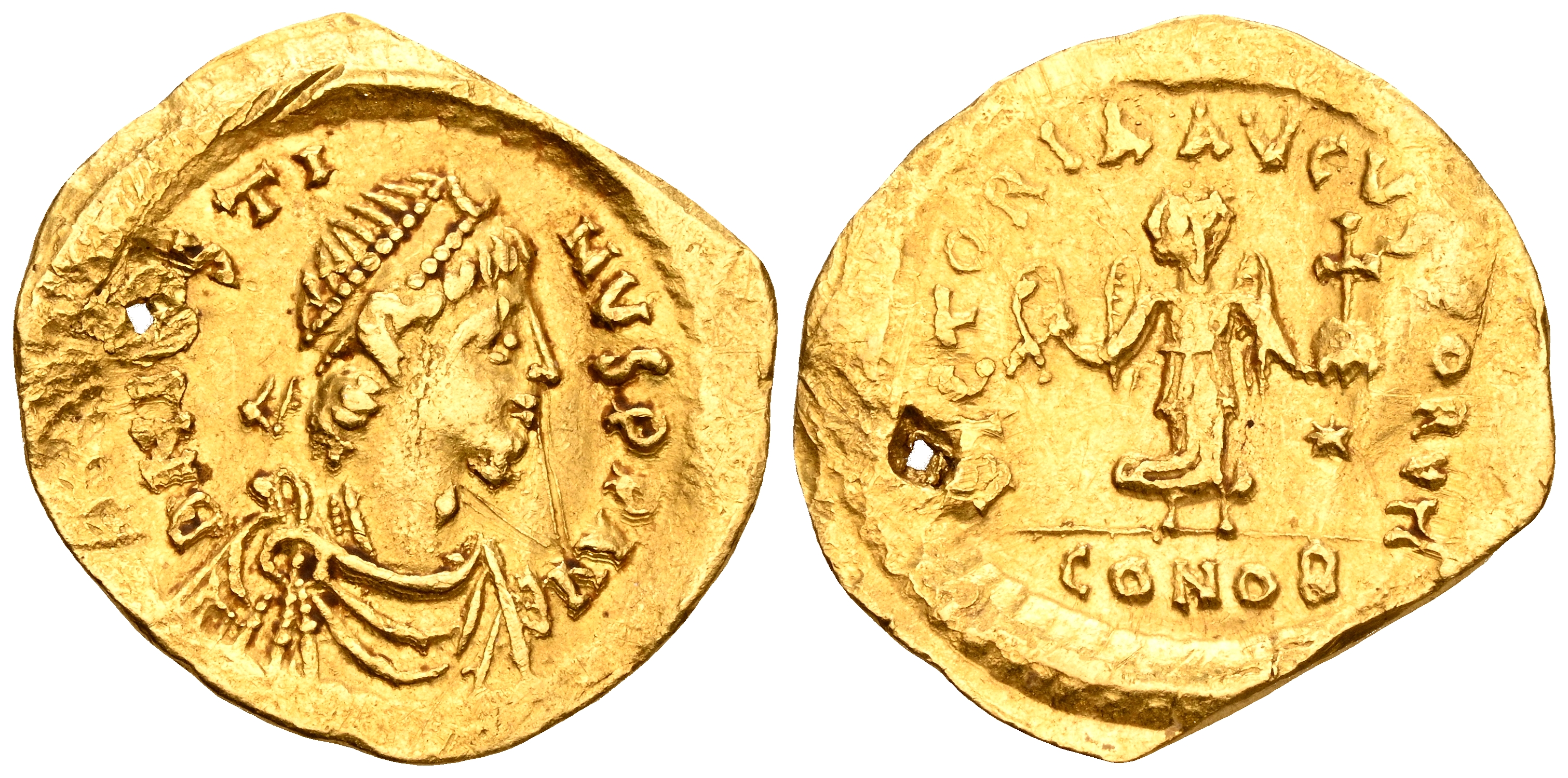 JUSTINO I. Tremissis. (Au. 1,38g/15mm). 518-527 d.C. Constantinopolis. (Seaby 58). Anv: Busto laureado, drapeado y con coraza de Justino I a derecha, alrededor leyenda: D N IVSTINVS P P AVG. Rev: Victoria avanzando a derecja portando corona de laurel y con globo crucífero, en campo: estrella, en exergo: CONOB, alrededor leyenda: VICTORIA AVGVSTORVM. MBC+. Perforación.