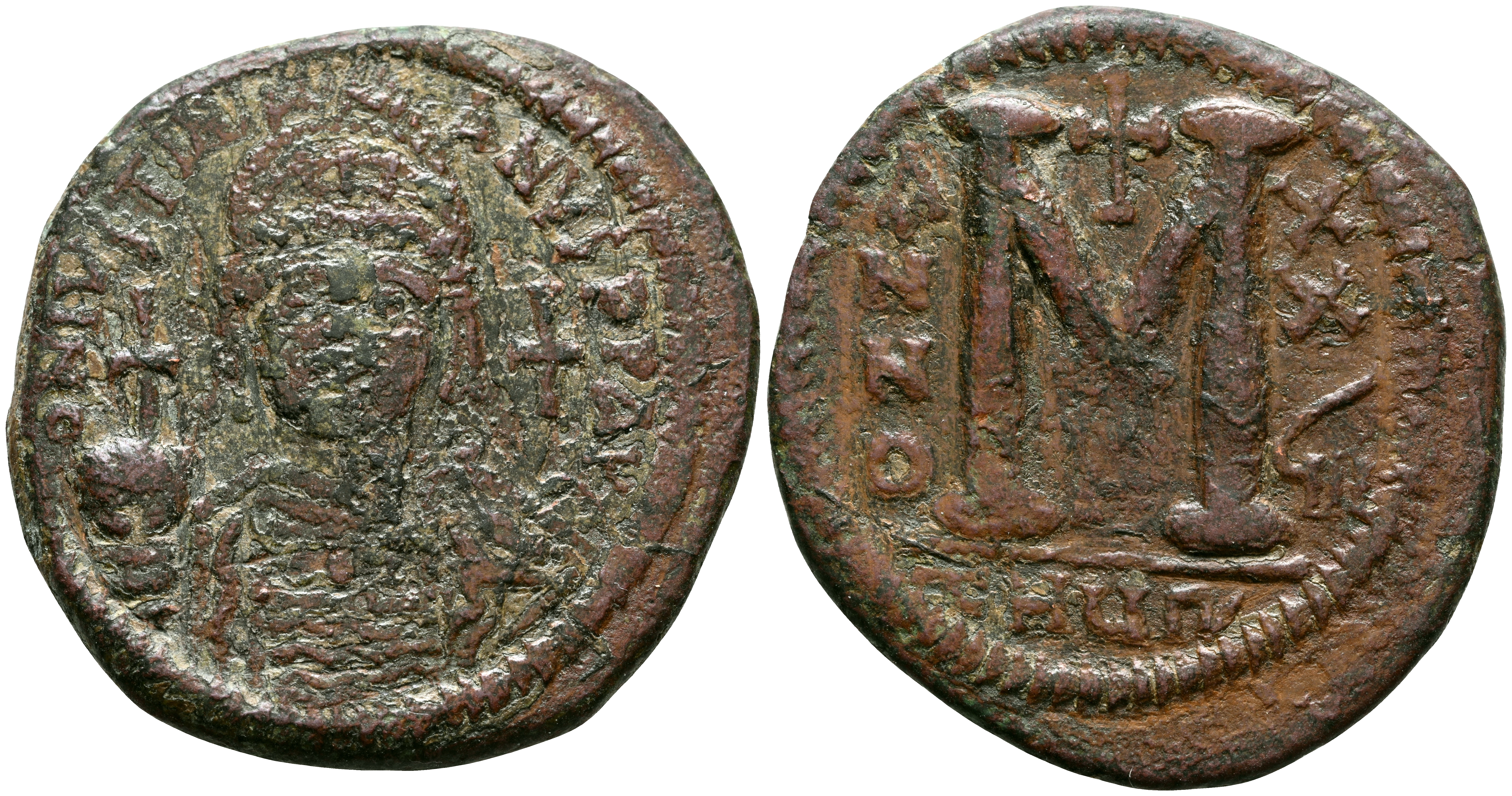 JUSTINIANO I. Follis. (Ae. 18,06g/35mm). 544-545 d.C. Antioquía. (Seaby 223). Anv: Busto coronado y acorazado de Justiniano de frente, sosteniendo globo crucífero a izquierda y escudo en mano a derecha, alrededor leyenda: D N IVSTINIANVS P P AVG. Rev: M grande; encima Cruz, a los lados: ANNO-XX/ÇII, en exergo: THUP. MBC-.
