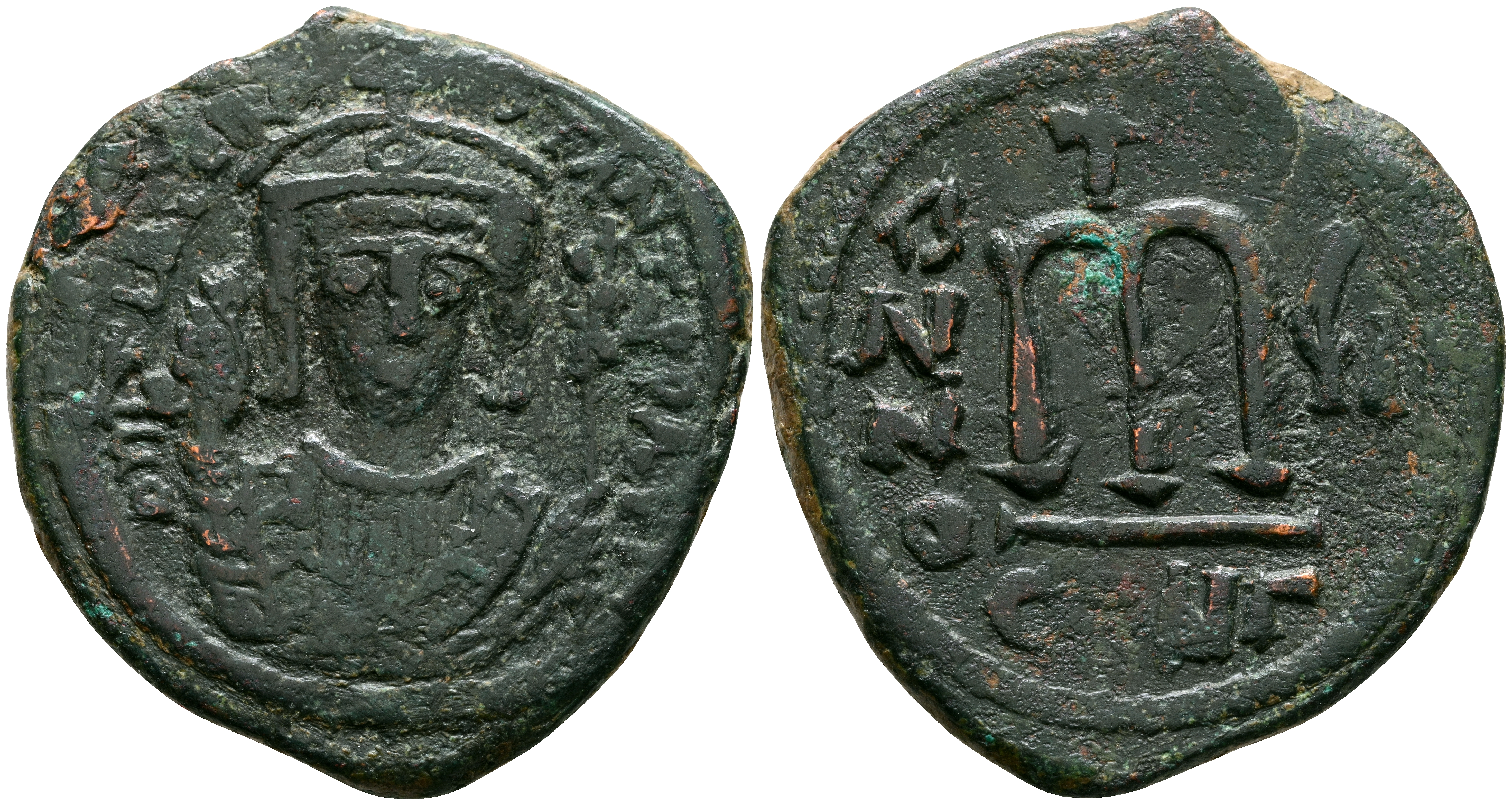 TIBERIO II COSTANTINO. Follis. (Ae. 12,35g/30mm). 578-582 d.C. Constantinopla. (Seaby 430). Anv: Busto de Tiberio II de frente con coraza y corona, alrededor leyenda: NTIB CONSTANT P P AV . Rev: M grande, entre: ANNO-4I, encima cruz, en exergo: CONr. MBC.