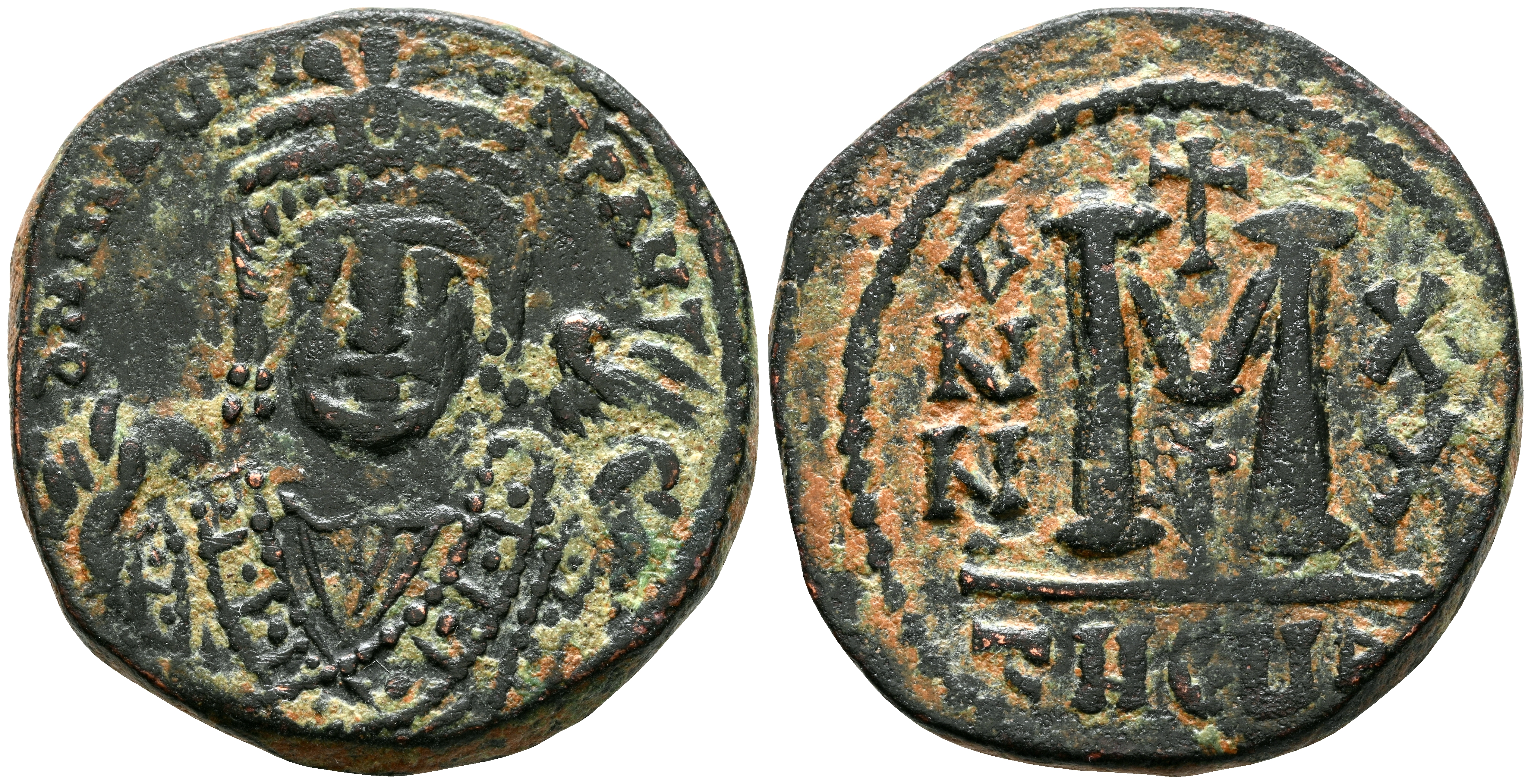 MAURICIO TIBERIO. Follis. (Ae. 10,26g/27mm). 601-602 d.C. Teóupolis (Antioquía). (Seaby 533). Anv: Busto de Mauricio Tiberio de frente con coraza y corona, alrededor leyenda: DN MAVRI C N P AVT. Rev: M grande, encima cruz, a los lados: ANNO-XX, en ex ergo: THEUPS. MBC.