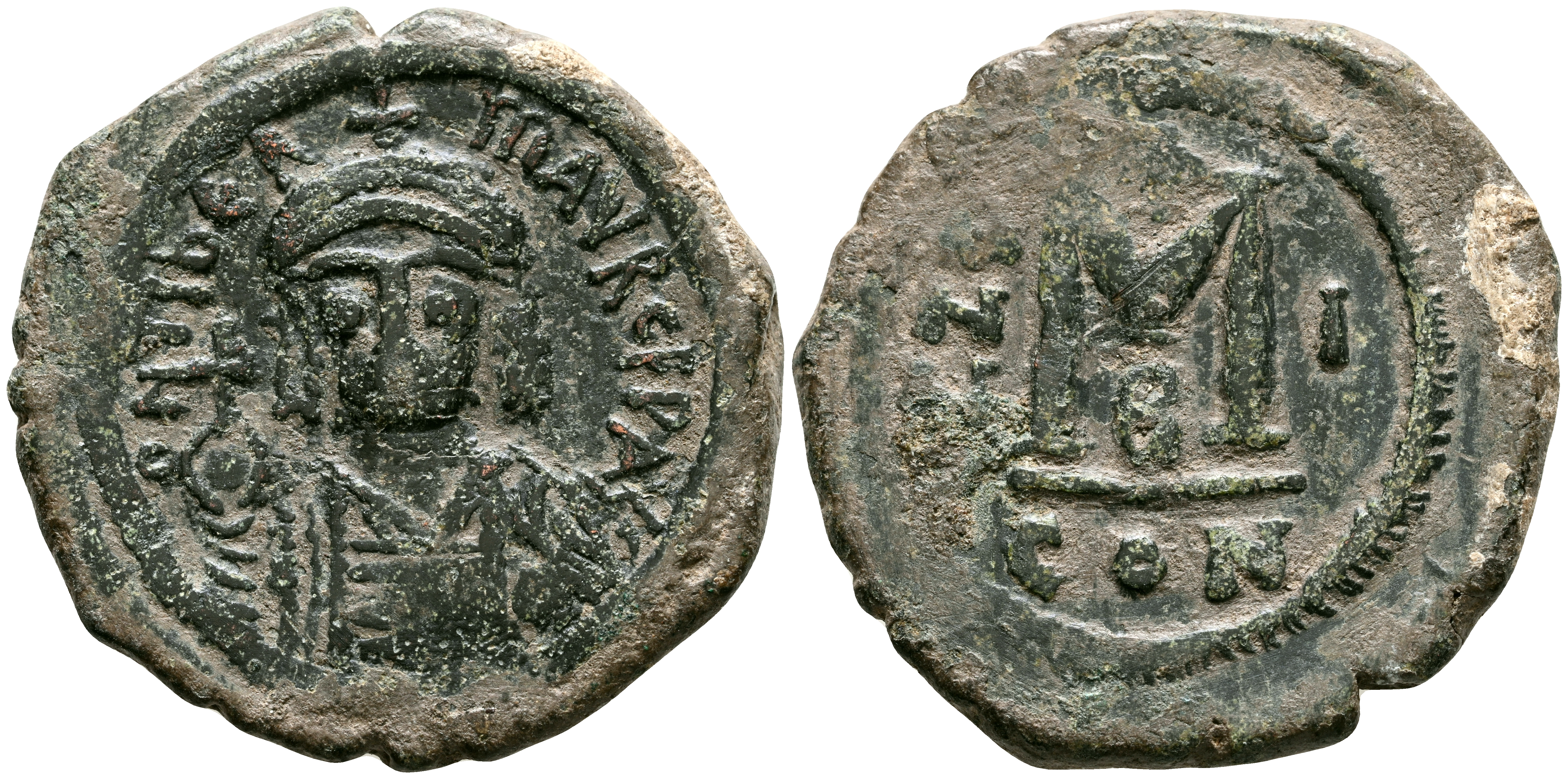 MAURICIO TIBERIO. Follis. (Ae. 13,00g/31mm). 569-570 d.C. Constantinopla. (Seaby 533). Anv: Busto de Mauricio Tiberio de frente con corona y coraza sujetando orbe, alrededor leyenda: DN MAVRI C N P AVG. Rev: M grande, entre: ANNO-I, encima cruz, debajo B, en exergo: CON. MBC/MBC-.