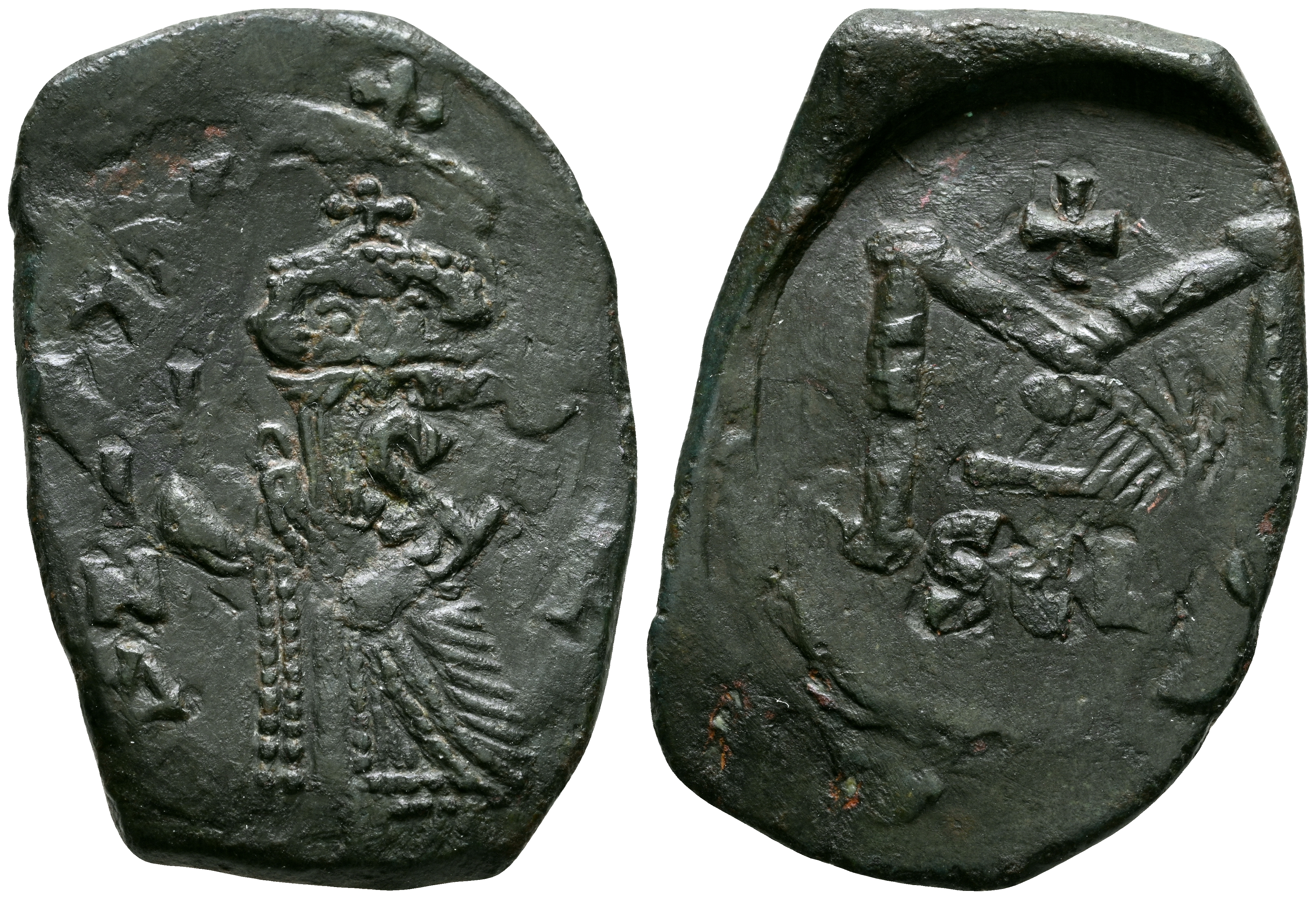 CONSTANTE II. Follis (Ae. 4,99g/28mm). 623-653 d.C. (Año 11). Siracusa. (DOC 179; Seaby 1107). Anv: Constante II estante de frente, con barba larga y corona, sosteniendo el globo crucífero, alrededor: I/N/∆ - I/A. Rev: M grande superada por cruz, deb ajo: SCL. MBC.
