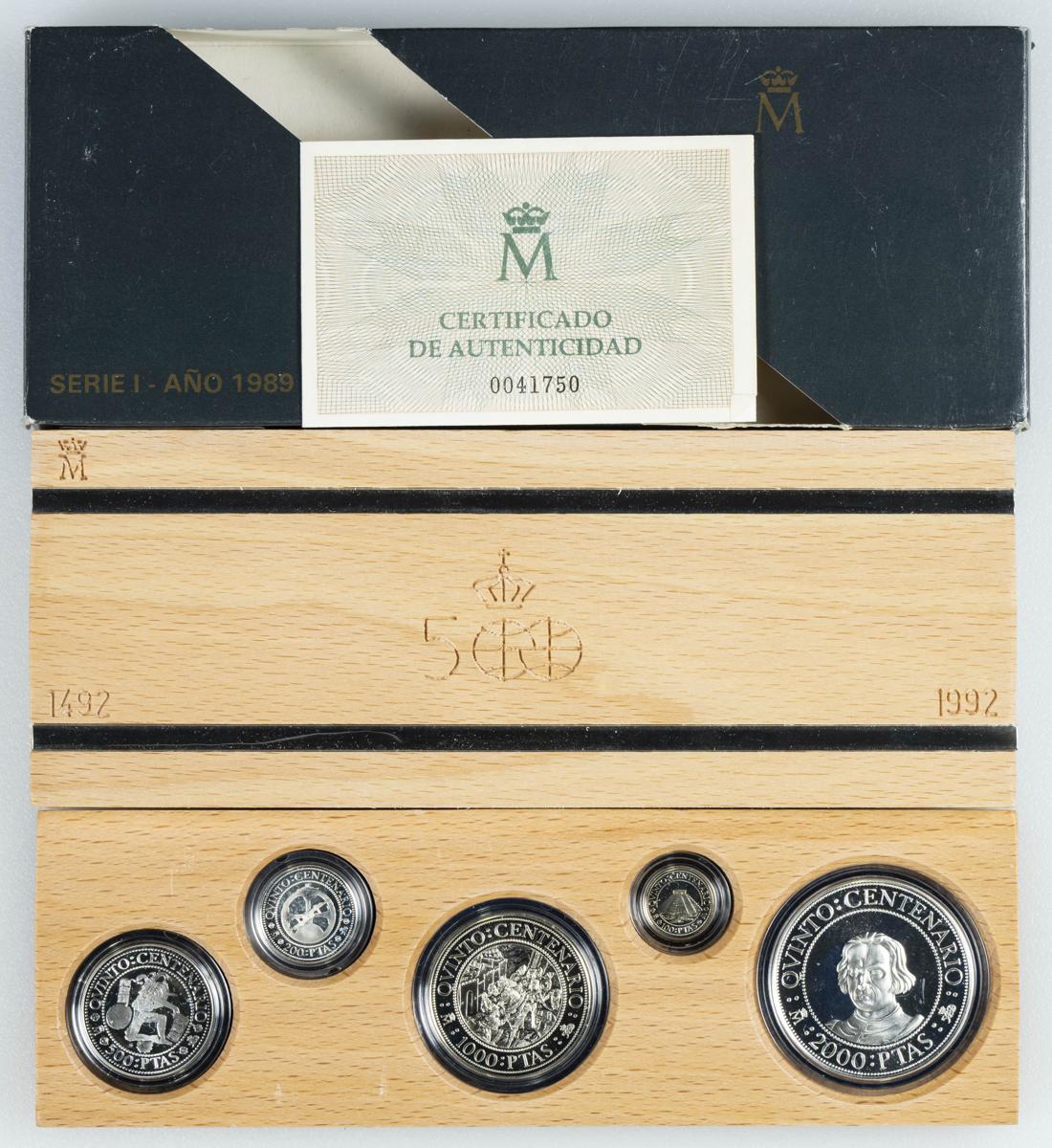 JUAN CARLOS I (1975-2014). Estuche completo compuesto por 5 monedas en plata de valores comprendidos entre 100 y 2000 Pesetas. Quinto Centenario. 1989. Serie I. FNMT. FDC Mate. Incluye estuche original y certificado de autenticidad.