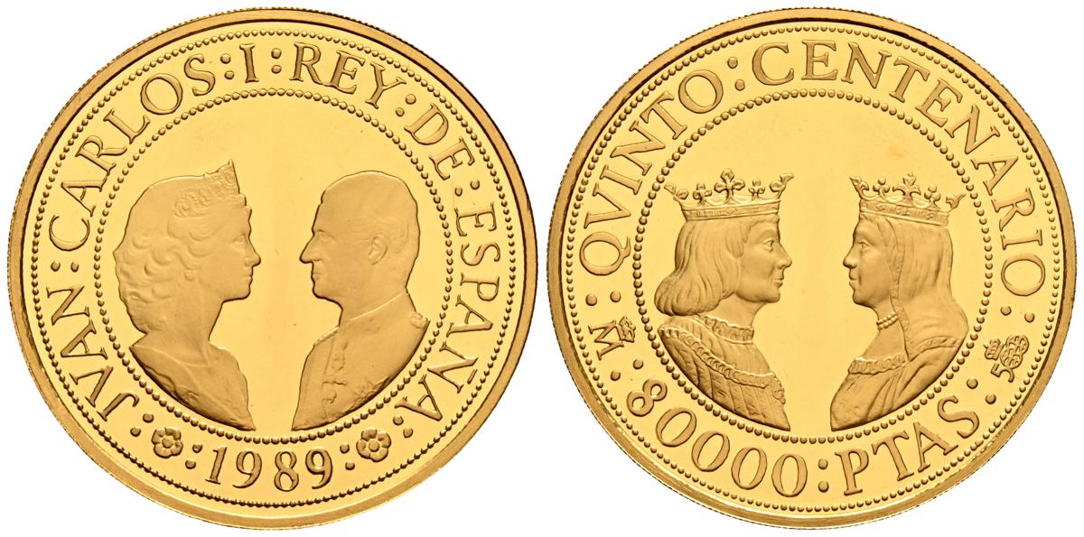 JUAN CARLOS I (1975-2014). 80.000 Pesetas. (Au. 27,00g/38mm). Quinto Centenario. Serie I. 1989. FNMT. PROOF. Presentada en estuche oficial y con certificado de autenticidad