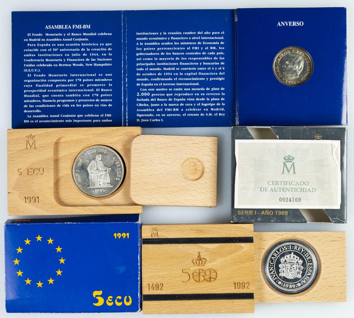 JUAN CARLOS I (1975-2014). Conjunto de 3 estuches/set con valores de 2000 Pesetas, 5000 Pesetas y 5 Ecus. Terminaciones PROOF y FDC. A EXMINAR.
