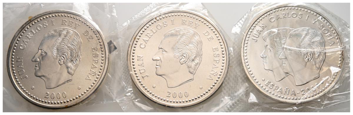JUAN CARLOS I (1975-2014) Conjunto de 3 monedas de plata con valores de 2000 Pesetas (2) y 12 Euros (1). En blísters originales (uno de ellos abierto). SC. A EXAMINAR.