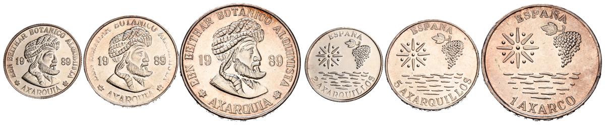 Serie completa en plata con valores de 2 y 5 Axarquillos y 1 Axarco. 1989. Axarquía (Málaga). Peso aproximado del conjunto: 34g. SC.
